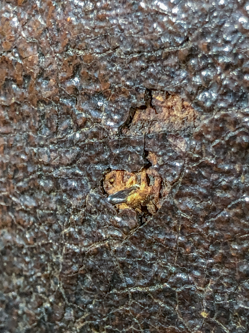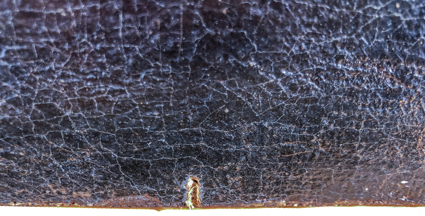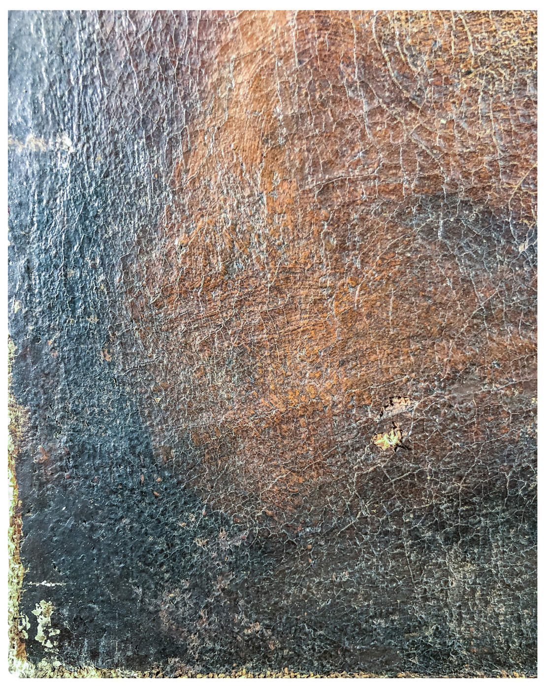 Stato di conservazione. Superficie: 80% (craquelures, cadute di colore, un punto di cedimento della tela da perforazione in basso a sinistra in corrispondenza di una caduta di colore)