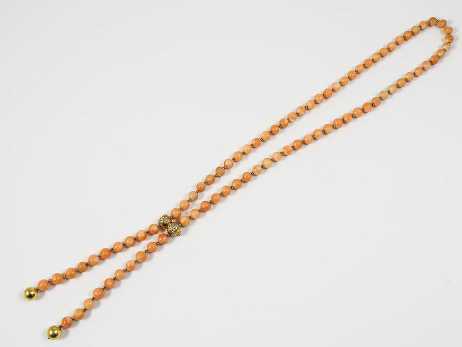 COLLANA IN CORALLO ROSA fermezza in oro giallo e diamanti lungh cm 80, diam sfere mm 8, diamanti ct 0,40 circa, gr 72 PINK CORAL LONG NECKLACE