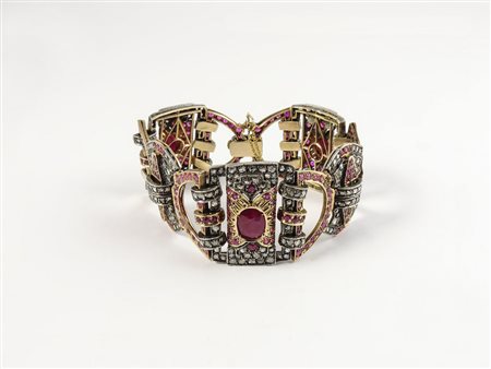 BRACCIALE A PIASTRE IN ORO GIALLO, ARGENTO, RUBINI E DIAMANTI realizzato in stile Novecento gr 66,2 YELLOW GOLD AND SILVER BRACELET WITH RUBIES AND DIAMONDS