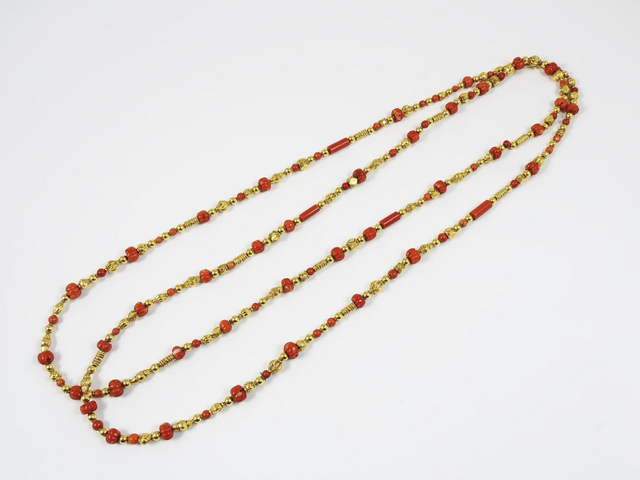 COLLANA IN CORALLO ROSSO CON INSERTI IN ORO GIALLO India realizzata con dischi in corallo alternati a sfere in filigrana lungh cm 150, gr 97,2 VERY LONG RED CORAL AND YELLOW GOLD INDIAN NECKLACE