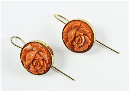 PAIO DI ORECCHINI IN ORO GIALLO E CORALLO ROSSO coralli incisi a motivo floreale gr 14,5 YELLOW GOLD AND CARVED CORALS EARRINGS