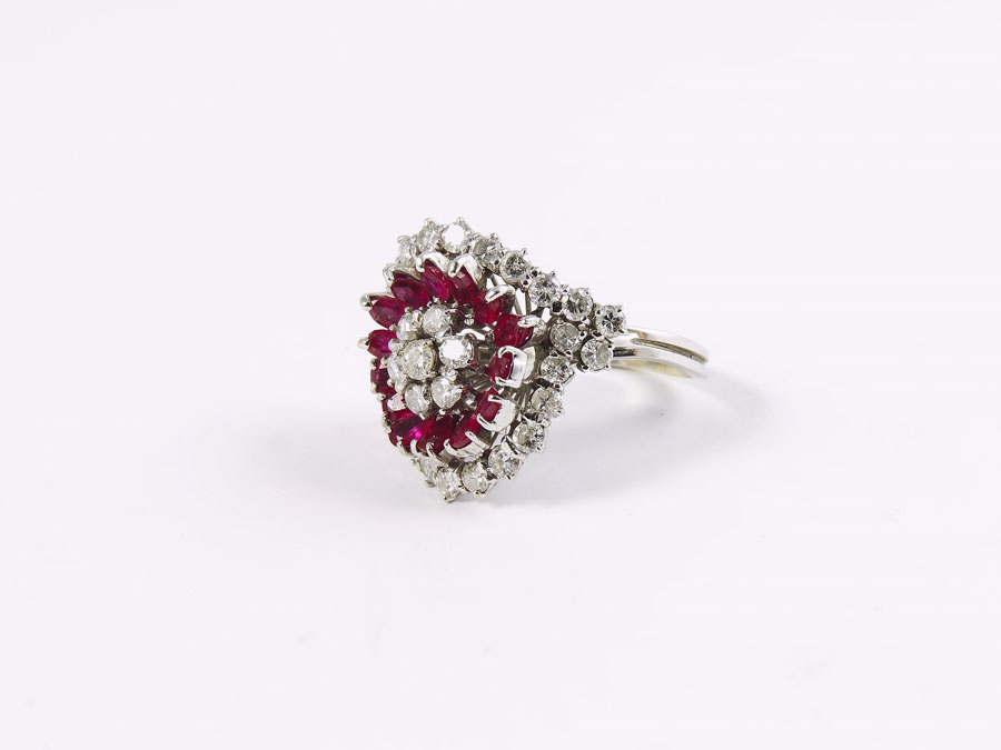 ANELLO IN ORO BIANCO, DIAMANTI E RUBINI realizzato come una margherita diamanti cts 2,20 circa, rubini cts 1,50 circa, gr 10,6 RUBIES AND DIAMONDS WHITE GOLD RING