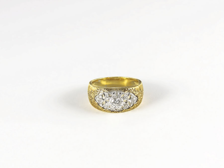 ANELLO IN ORO BIANCO, ORO GIALLO E DIAMANTI Mario Buccellati satinato e inciso, un piccolo diamante mancante diamante centrale cts 0,25 circa, gr 6,6 Mario Buccellati gold and diamonds ring