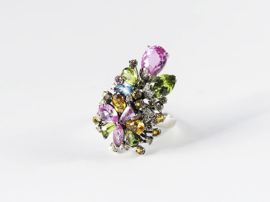 ANELLO IN ORO BIANCO, DIAMANTI E PIETRE SEMIPREZIOSE realizzato come un grappolo multicolore gr 14,4 PINK TOURMALINES, PERIDOTS, GOLDEN QUATZ AND DIAMONDS WHITE GOLD RING