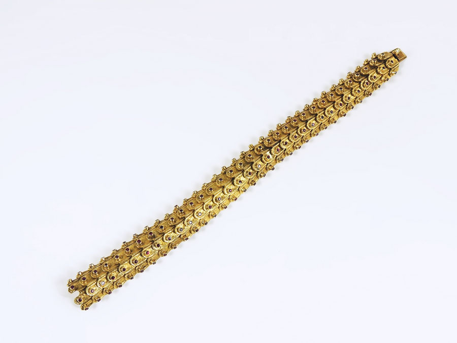 Lotto 963 | BRACCIALE IN ORO GIALLO E RUBINI Anni Sessanta realizzato con maglie a squame...