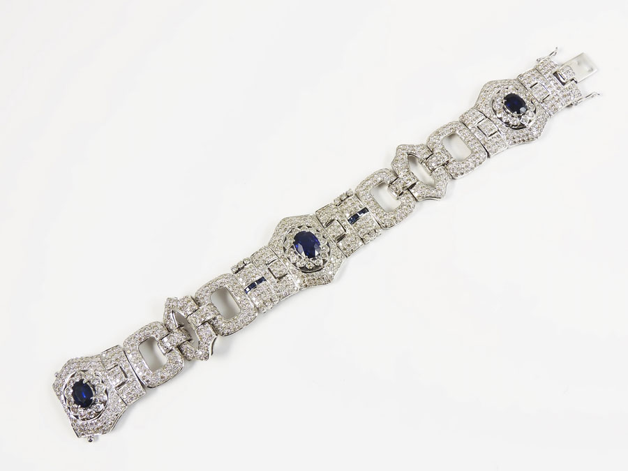 BRACCIALE IN ORO BIANCO, DIAMANTI E ZAFFIRI realizzato in stile anni Venti a maglie geometriche tempestate di diamanti e impreziosite da tre zaffiri ovali, diamanti cts 12 circa, zaffiri cts 5 circa, gr 63,7 White gold, diamonds and sapphires DECÒ STYLE BRACELET
