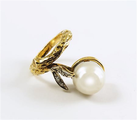 ANELLO IN ORO GIALLO E PERLA COLTIVATA realizzato come un rametto che sorregge una perla con piccole foglie impreziosite da brillanti gr 9,7