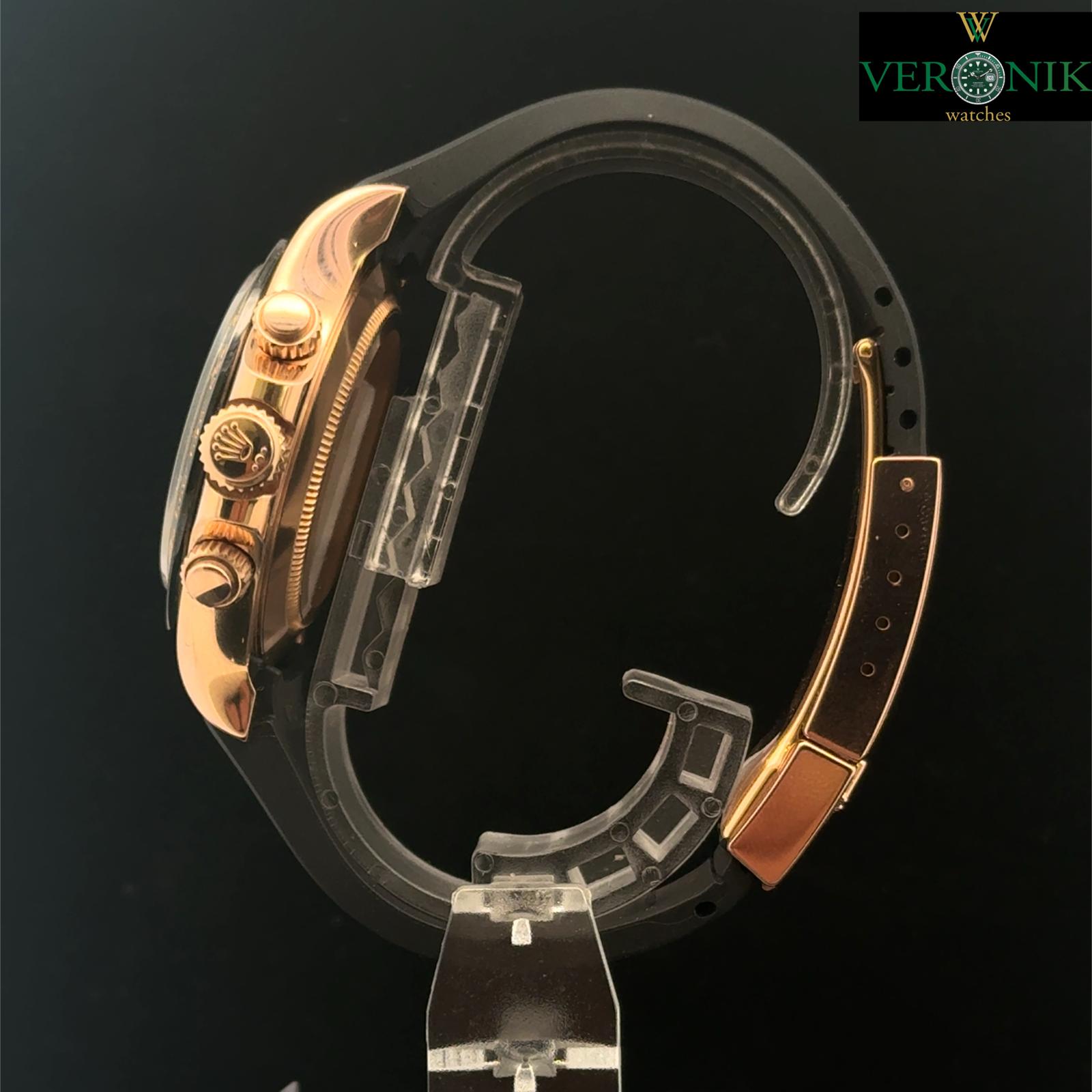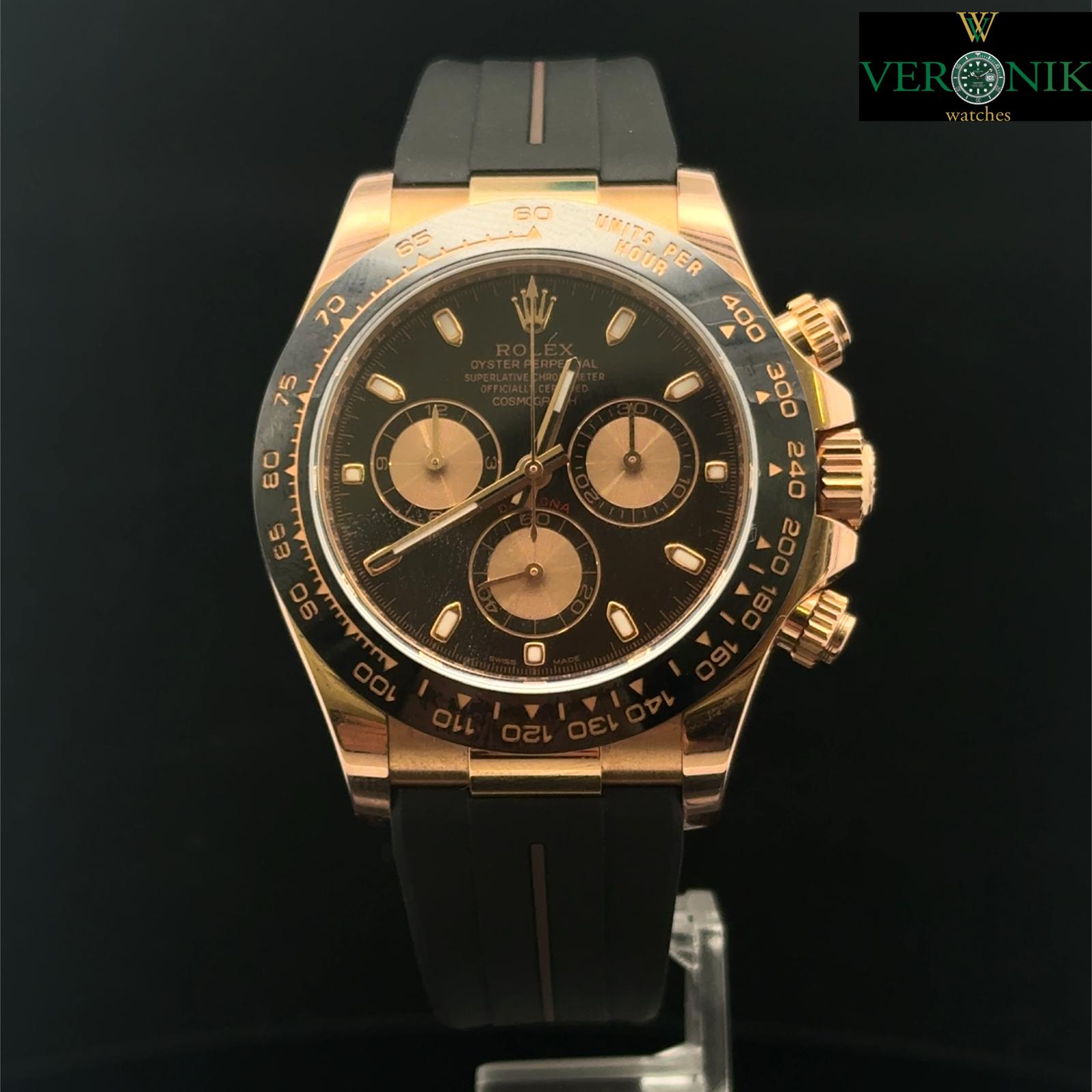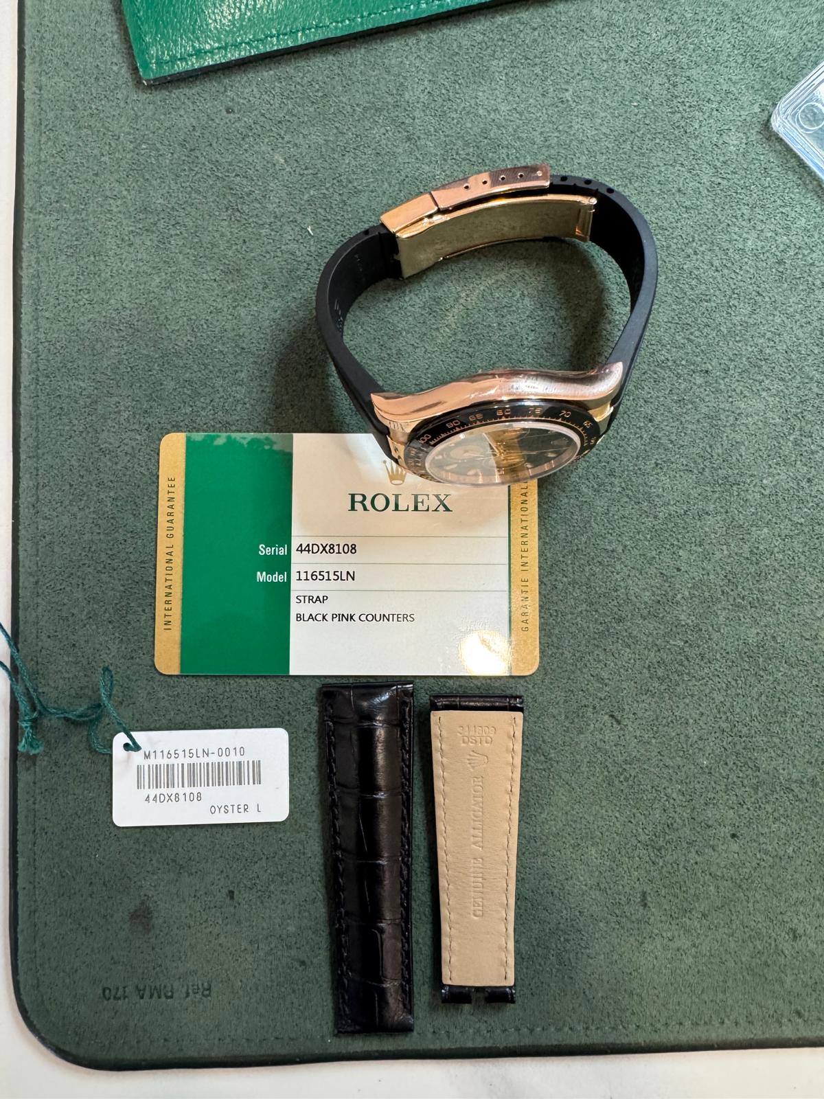 Marca Rolex Modello (Orologio) Daytona Numero di referenza 116515ln (Everose) Carica Automatico Materiale della cassa Oro rosa Materiale cinturino oysterflex Anno di produzione 2016 (Anno approssimativo) Corredo documenti originali, no box Calibro Carica Automatico Materiale della cassa Oro rosa Diametro 40 mm Impermeabile 10 ATM Materiale lunetta Ceramica Vetro Vetro zaffiro Numeri sul quadrante Senza numeri Colore cinturino Nero aftermarket È presente anche cinturino originale pelle nuovo Chiusura Déployante Materiale chiusura Oro rosa Funzioni Cronografo - COMMISSIONE D’ASTA 25%
