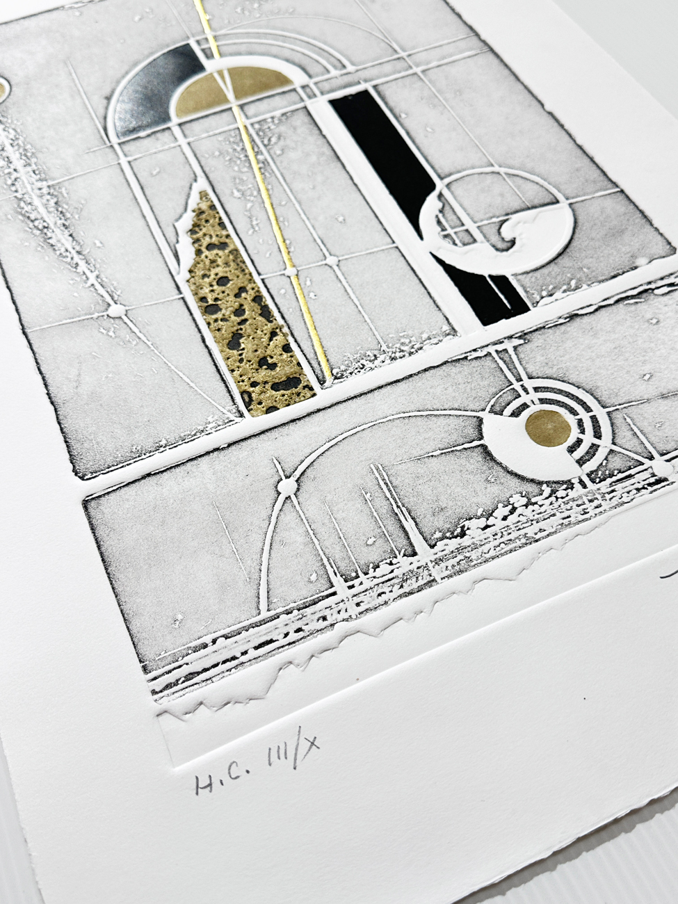 Acquaforte e acquatinta con battuta a secco e retouchè foglia oro su carta Magnani di Pescia
