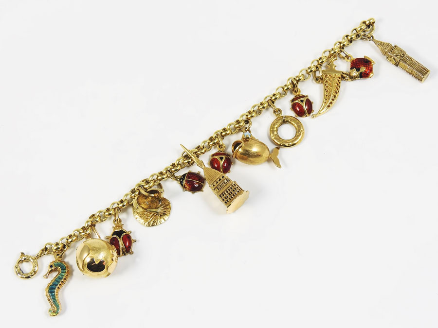 BRACCIALE CHARMS IN ORO GIALLO E SMALTI charms modellati come la Mole Antonelliana, il Big Ben, coccinelle e altre curiosità presenta marchi inglesi varie leghe dell'oro, gr 41,6 CHARMS BRACELET IN YELLOW GOLD AND ENAMELS
