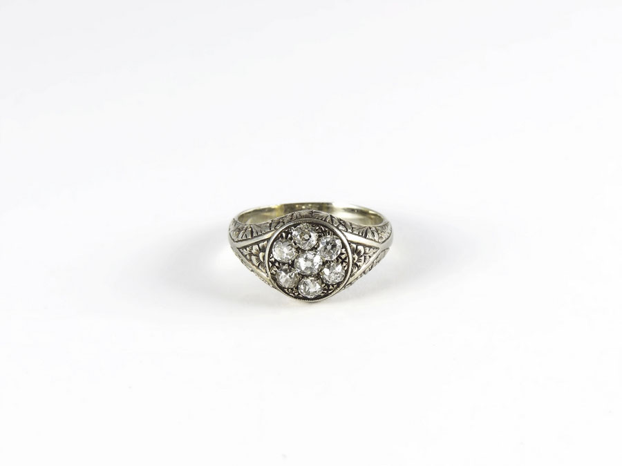 ANELLO IN ORO BIANCO E DIAMANTI Anni Cinquanta inciso con motivi floreali diamanti taglio vecchio cts 1 circa, gr 7,5 WHITE GOLD AND DIAMONDS RING WITH FLOREAL CARVINGS