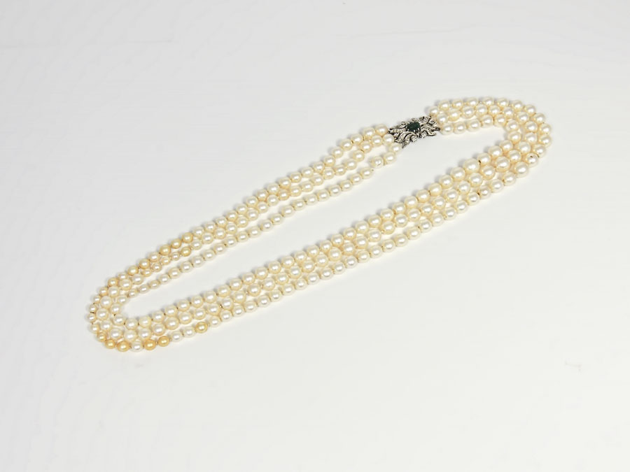 COLLANA A TRE FILI DI PERLE COLTIVATE IN ACQUA SALATA DEGRADÉ con fermezza in oro bianco, smeraldo e diamanti lung cm 60 circa, diam mm 4,5/9, smeraldo cts 1 ca THREE GRADUATED STRINGS OF CULTURED AKOYA PEARLS NECKLACE