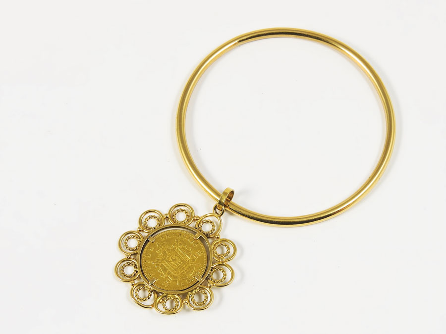 BRACCIALE A CERCHIO IN ORO GIALLO con moneta da 20 franchi di Napoleone in oro come pendente gr 42,50 20 NAPOLEON FRENCH FRANCS GOLD COIN MOUNTED IN A BRACELET