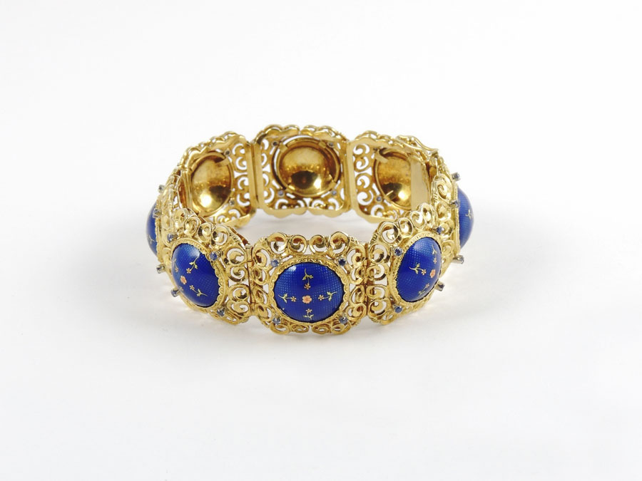 BRACCIALE IN ORO GIALLO CESELLATO E SMALTI BLU Anni Cinquanta realizzato a motivi floreali gr 56,4 BLUE ENAMEL AND CARVED YELLOW GOLD BRACELET