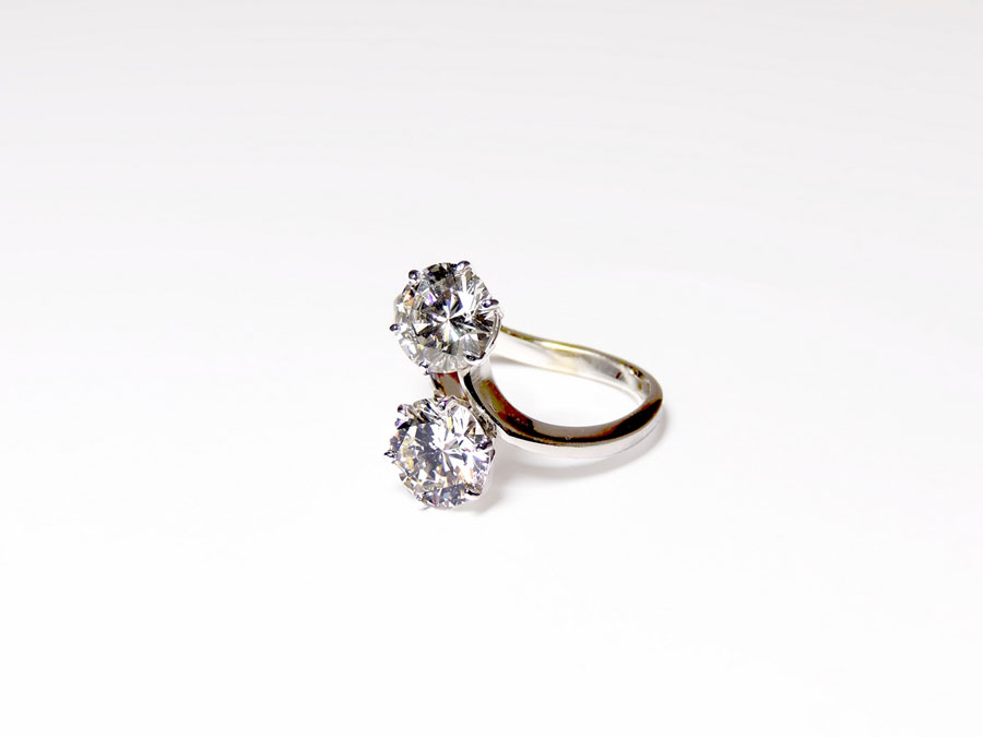 ANELLO CONTRARIÉ IN ORO BIANCO realizzato con coppia di diamanti taglio brillante rotondo contrapposti cts 4,30 circa complessivi, gr 3,60 WHITE GOLD RING WITH A PAIR OF ROUND DIAMONDS