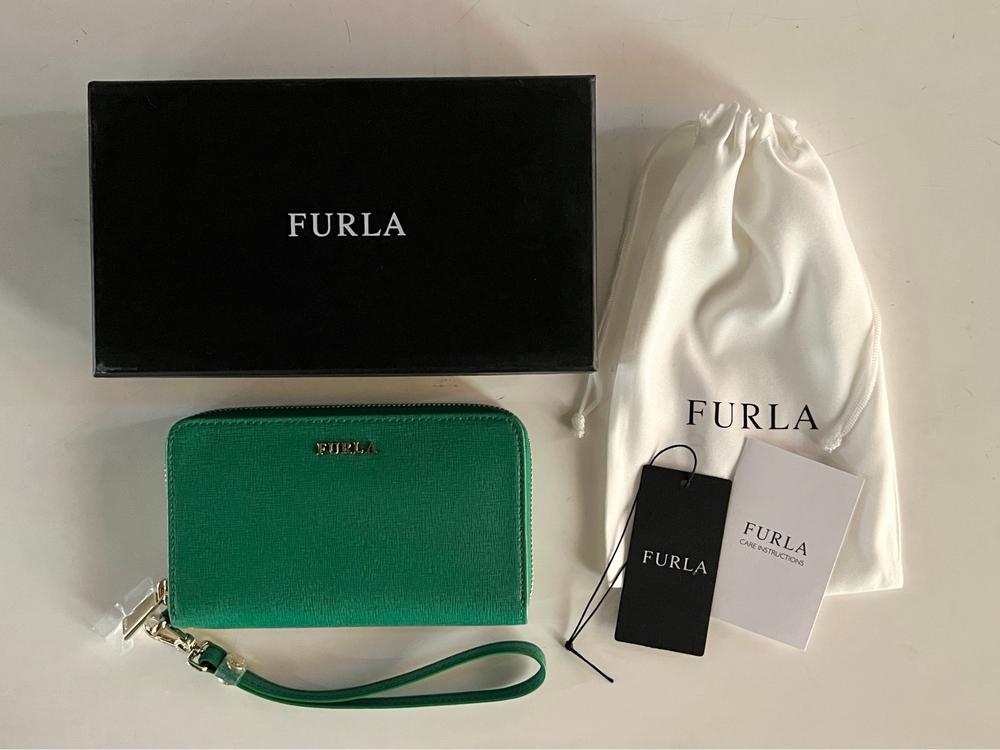 Furla Babylon L zip around wallet/wristlet in Emerald leather. High quality embossed leather with 4 credit card slots, 3 separated inner compartments, and removable wrist strap. Brand new with tags in original box with dustbag