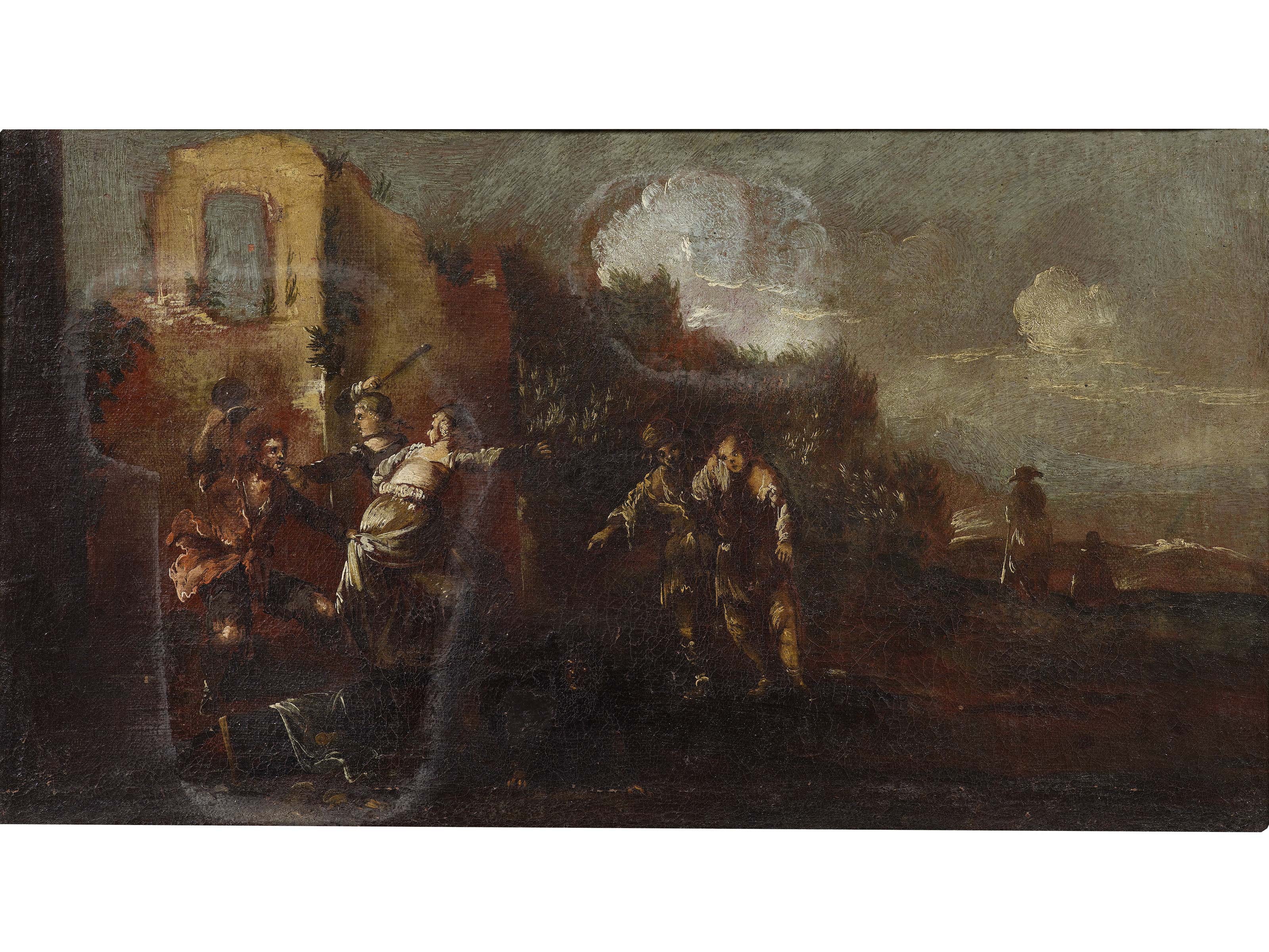 Scuola italiana (XVIII Secolo) Vattene da qui! Olio su tela Assaggio di pulitura centrale Cornice coeva 38.5x67.8 cm