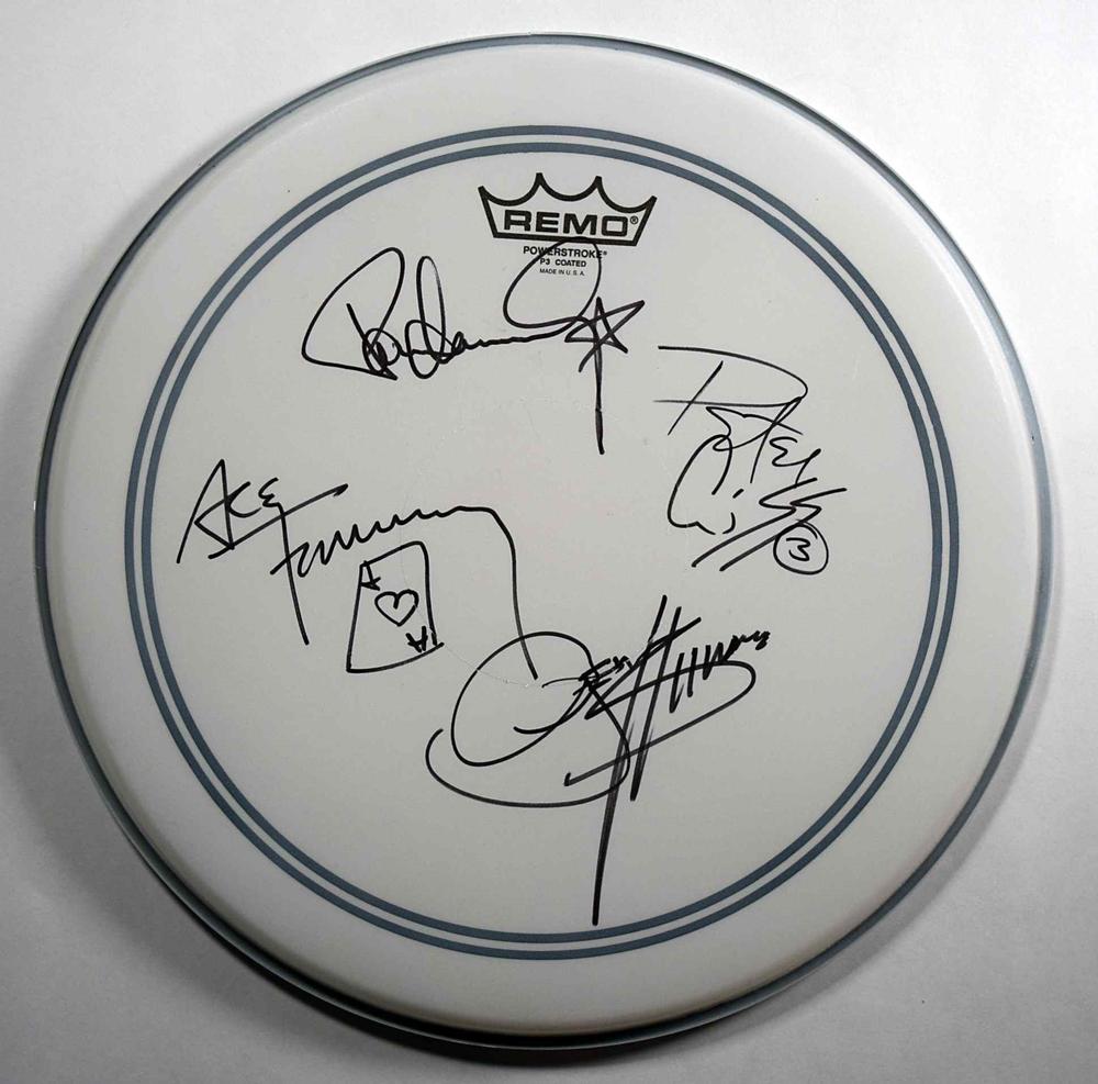 Kiss drumhead signed: Gene Simmons, Paul Stanley with a Star, Ace Frehley with Ace of Hearts Card, and Peter Criss 3