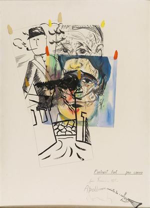 MONDINO ALDO Torino 1938 -2005 Apollinaire combatte tra i calligrammi 1975 Tecnica mista su carta 80x60 cm Firma, data e titolo in basso a destra Mixed media on paper Signature, date and title at the bottom right
