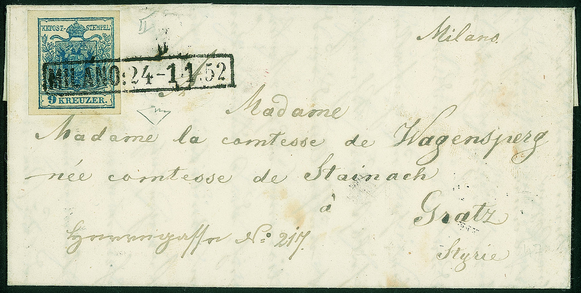 Affrancata con 9 kreuzer Austria secondo tipo annullato a Milano R52 (P.ti 13) 21.11 - eccezionale qualità - unica - cert. ED