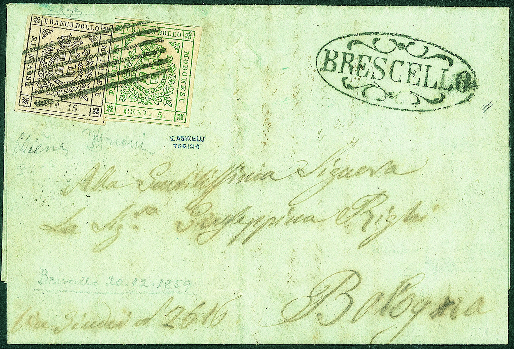 Antichi Stati Italiani - Modena - Governo Provvisorio - Bicolore composta da 5 cent verde + 15 cent bruno (12 + 13)Su lettera da Brescello a Bologna del 20.12.59 (unica conosciuta di questo ufficio) - 15 cent con margine corto in alto - Grioni + E. Diena + Asinelli + cert. Raybaudi