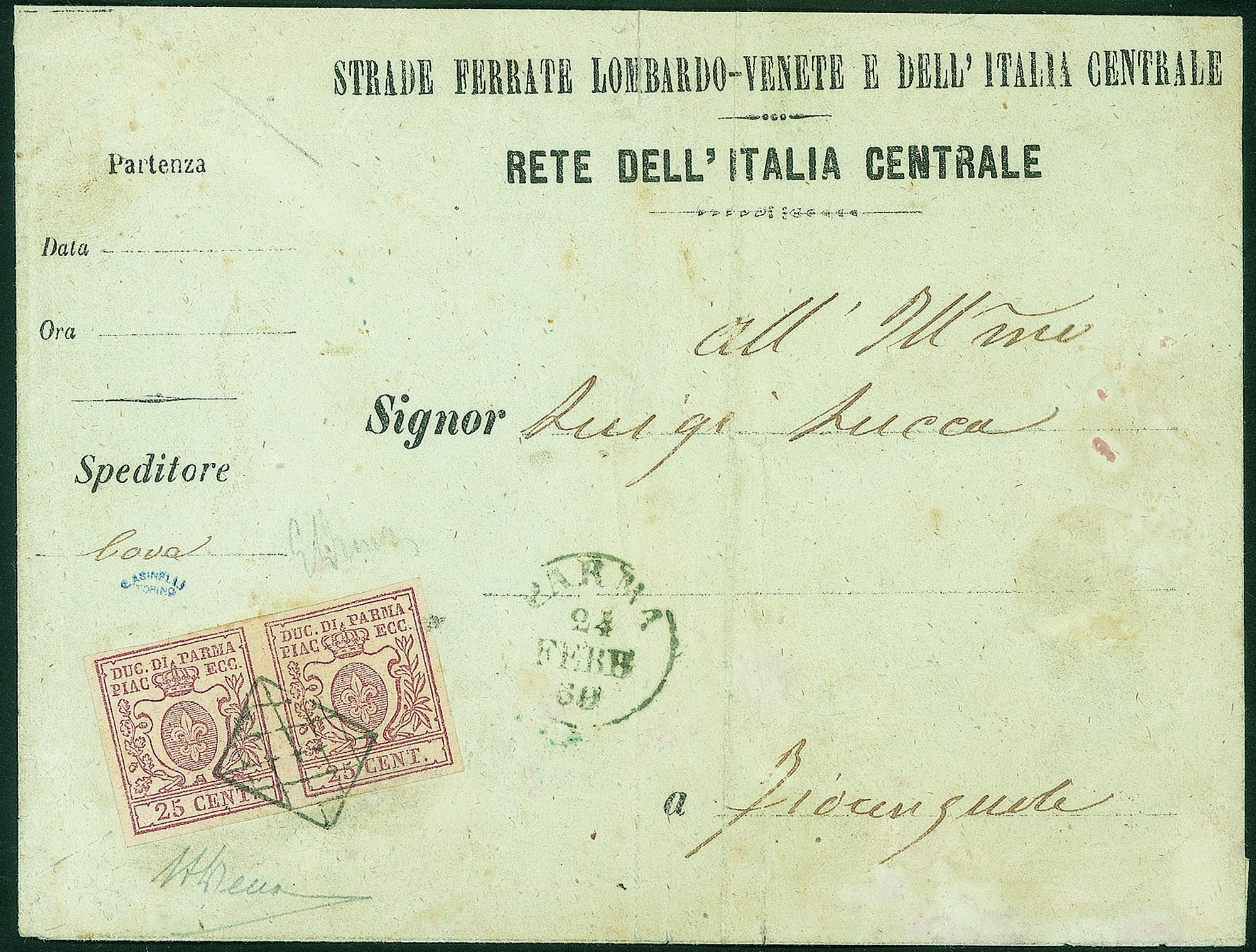 Antichi Stati Italiani - Parma - Coppia del 25 cent bruno lilla (10)Su busta delle Strade Ferrate Lombardo - Venete da Parma a Fiorenzuola del 24.2.60 - molto bella - ED + cert. AD