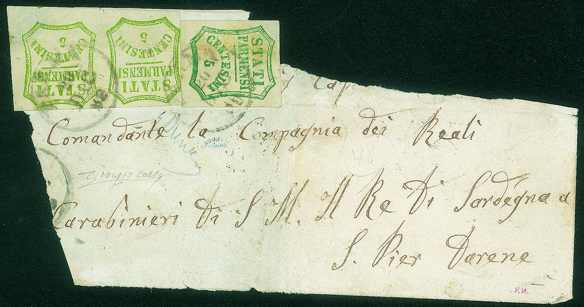Antichi Stati Italiani - Parma - Governo Provvisorio - Grande frammento di lettera affrancata con coppia del 5 cent verde giallo (13)In combinazione con il 5 cent verde azzurro (12) tutti ben marginati da Parma a S. Pier d'Arena del 20.12.59 - trattasi dell'unico documento postale noto con questa combinazione di valori gemelli - ex collezione Achillito Chiesa - ED + cert. Colla