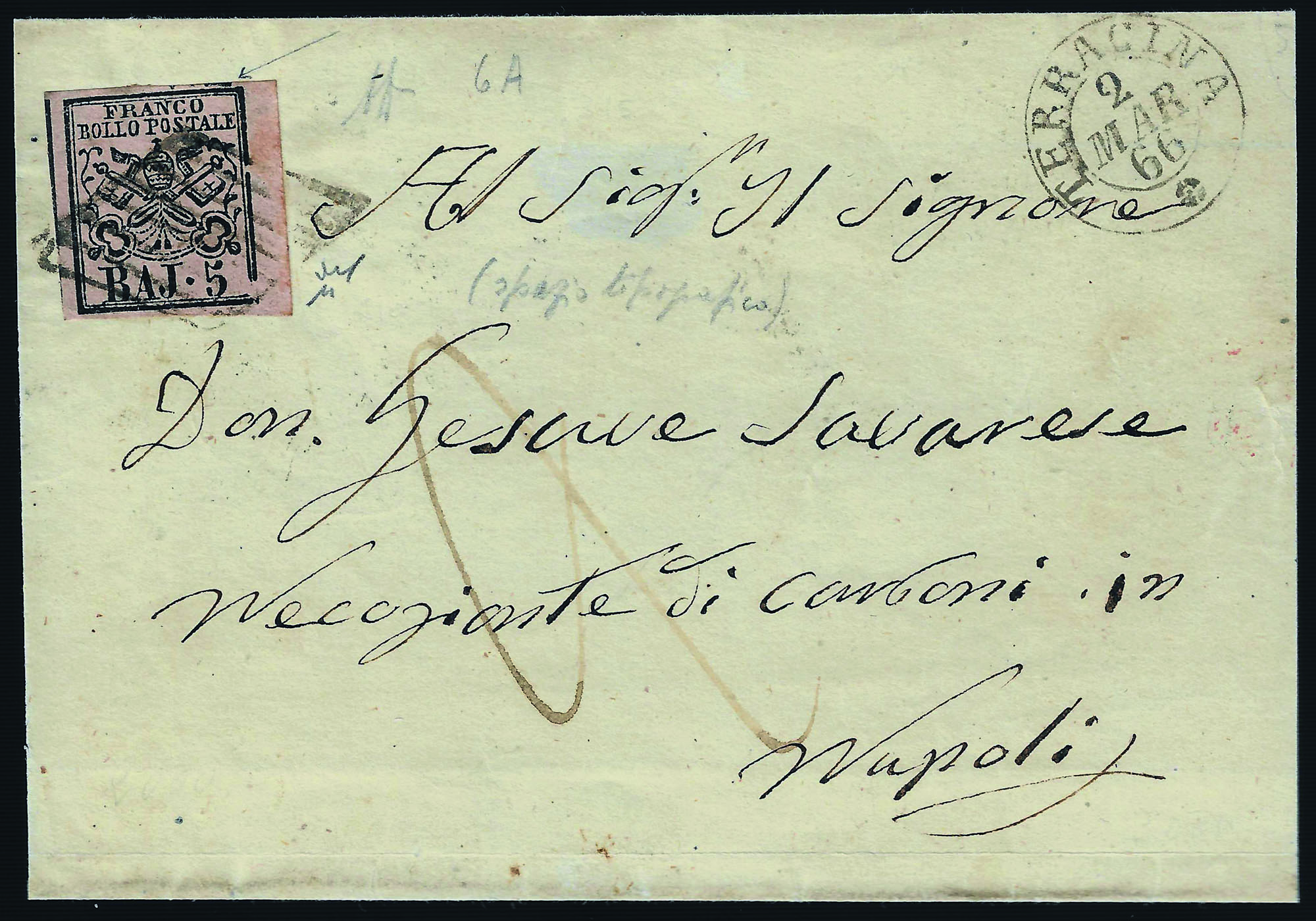 Antichi Stati Italiani - Stato pontificio - Lettera con b.5 rosa (6)Con varietà di stampa sul lato destro e presenza dello spazio tipografico in alto, da TERRACINA 2 MAR.66 per Napoli, inconsueta varietà