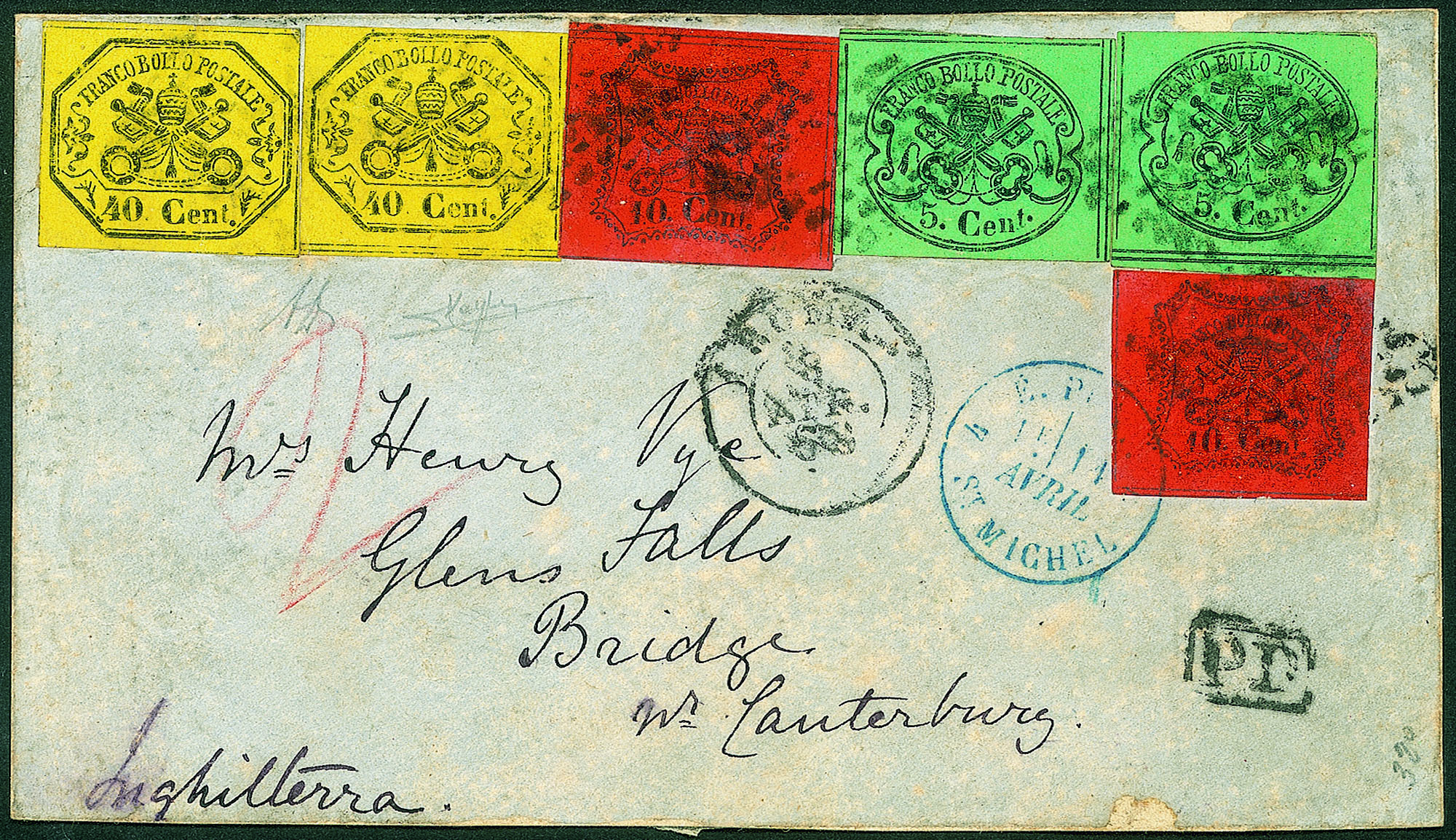 Antichi Stati Italiani - Stato pontificio - Due 5 cent + due 10 cent + due 40 cent della Ii emissione del Pontificio (16 + 17 + 19)Su frontespizio di busta da Roma a Canterbury del 8.4.68 - A. Diena + cert. Raybaudi