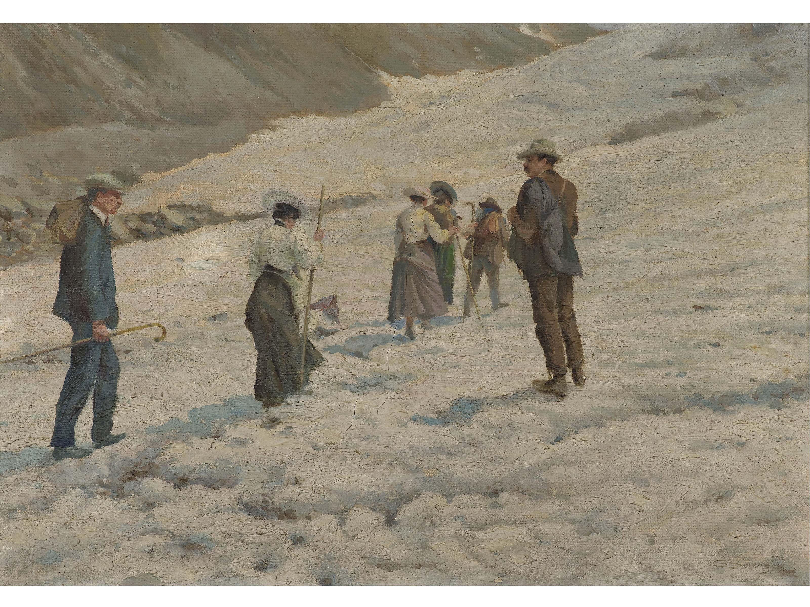 Giuseppe Solenghi (Milano1879-Cernobbio1944) La risalita nella neve Olio su tela 35x50 cm