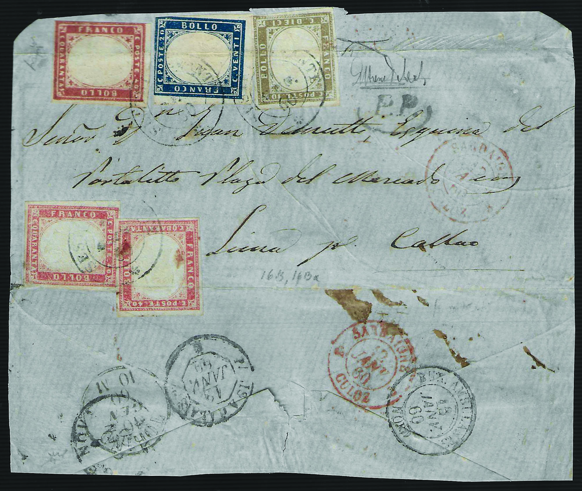 Antichi Stati Italiani - Sardegna - Destinazioni - Lettera per il PerùCon c.10 'cenere grigio seppia' + c.20 azzurro scuro + due esemplari c.40 rosso carminato + un esemplare c.40 rosso mattone (14Ae + 15B + 16B + 16Bb) da SESTRI LEVANTE 9 GEN.60, a lato il bollo P.P. in ovale nero per Callao, viaggita a mezzo dei piroscafi inglesi, insieme di particolare pregio e interessante per i valori gemelli del 40 centesimi, cert. Bottacchi