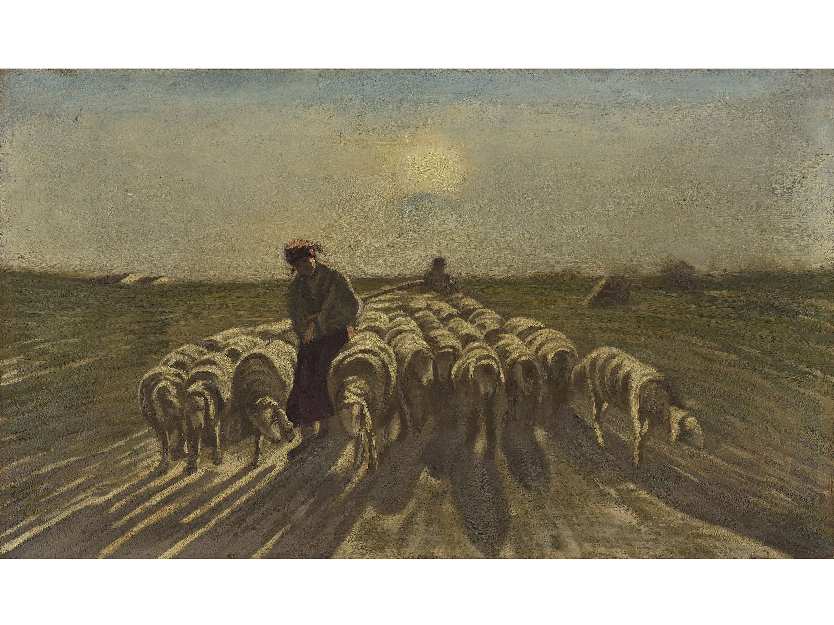 Anonimo (XX secolo) Rientro del gregge Olio su compensato 30x50 cm