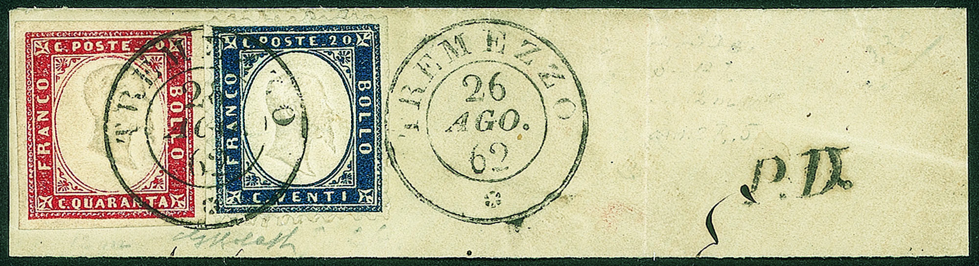 Regno - Vittorio Emanuele II - Frammento da TremezzoRecante un 40 cent Sardegna (16D) + 20 cent (2) - Bolaffi