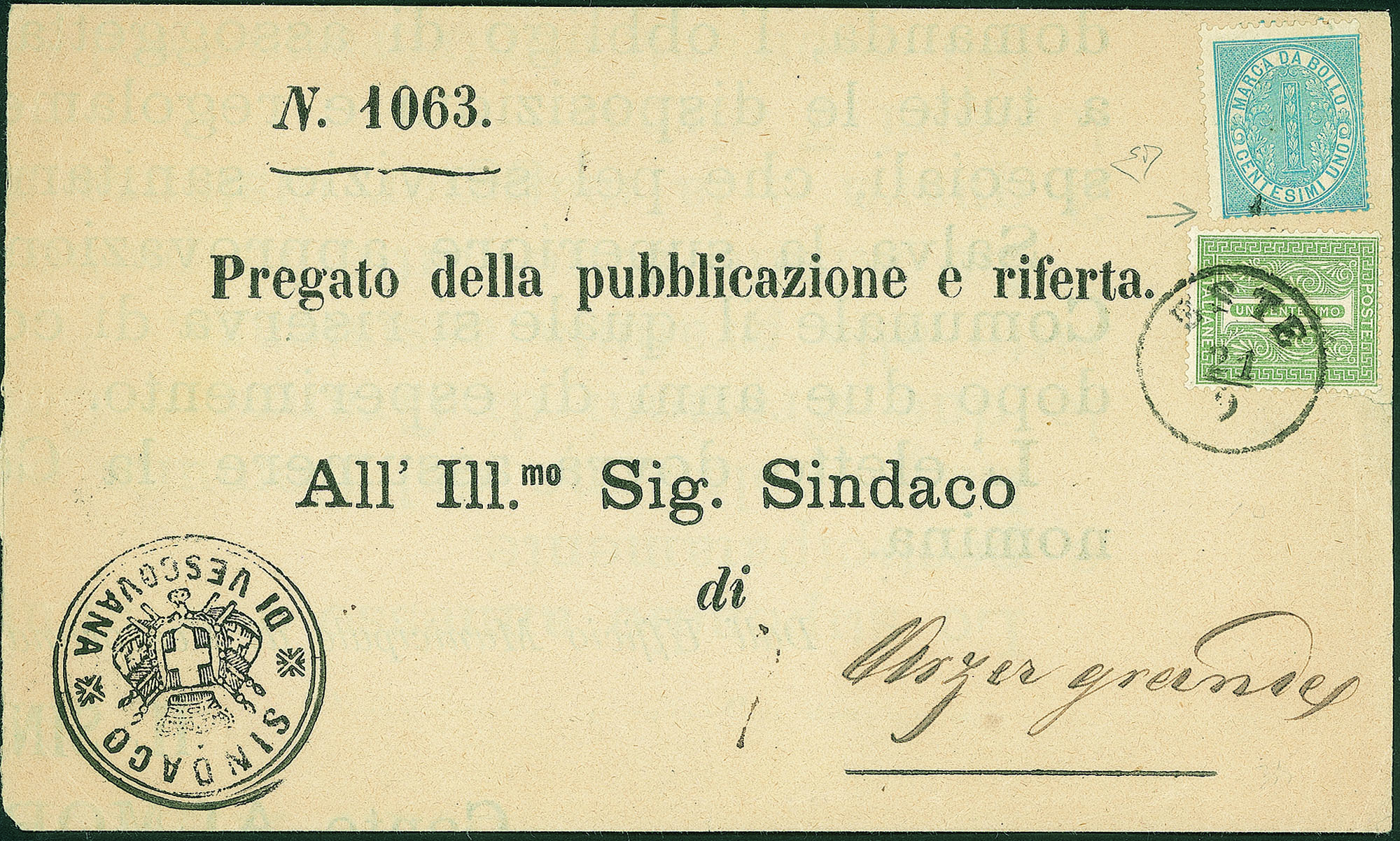 Regno - Vittorio Emanuele II - Circolare affrancata con 1 cent DLR (L14)Affrancato da Marca da Bollo da 1 cent da Este a Arzergrande del 21.9.78 - francobollo annullato con bollo austriaco e marca colpita da vite di ferro del bollo postale - cert. E. Diena