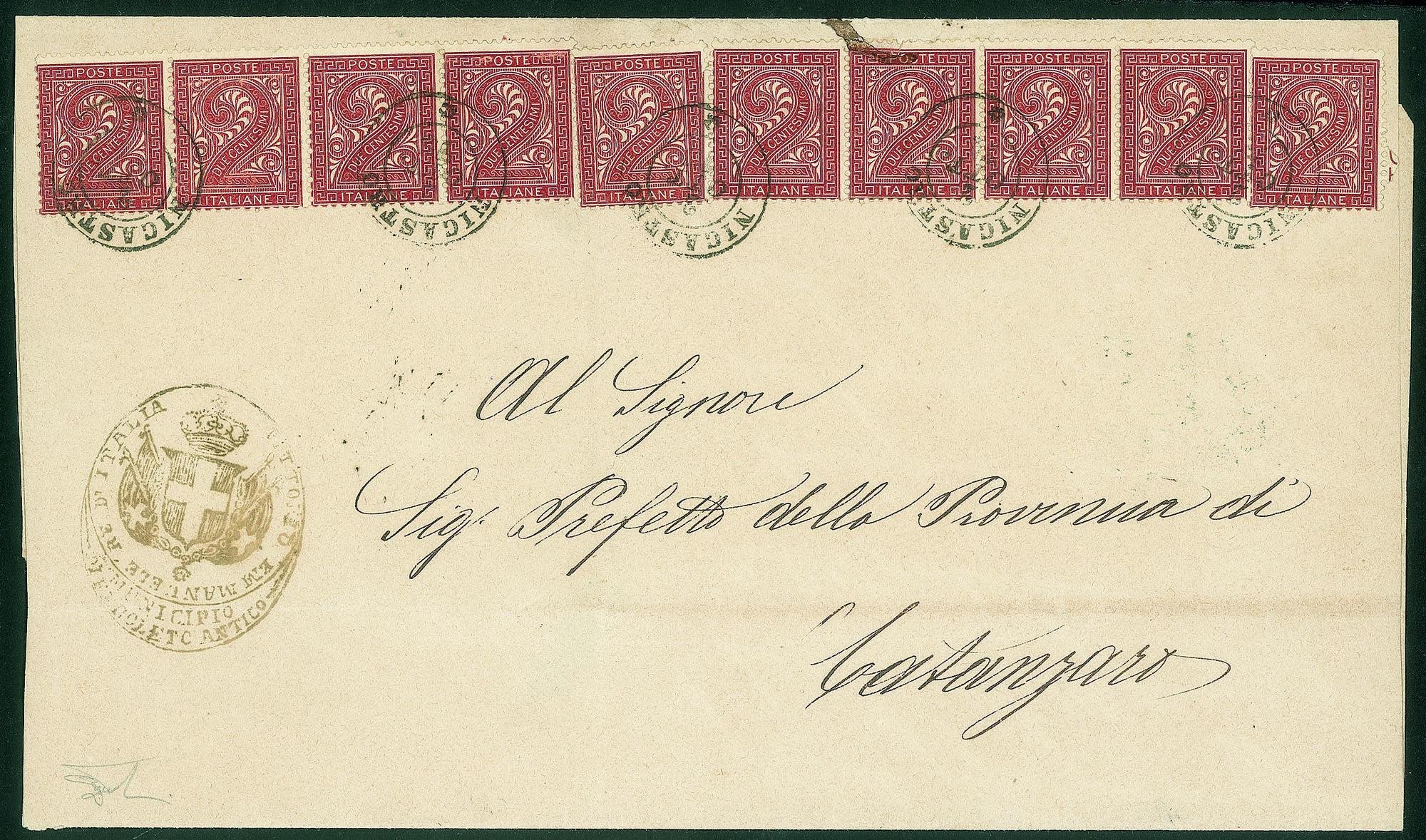 Regno - Vittorio Emanuele II - Due strisce di quattro + due esemplari singoli del 2 cent (T15)Su involucro di lettera da Nicastro a Catanzaro del 2.10.75 - cert. Bottacchi