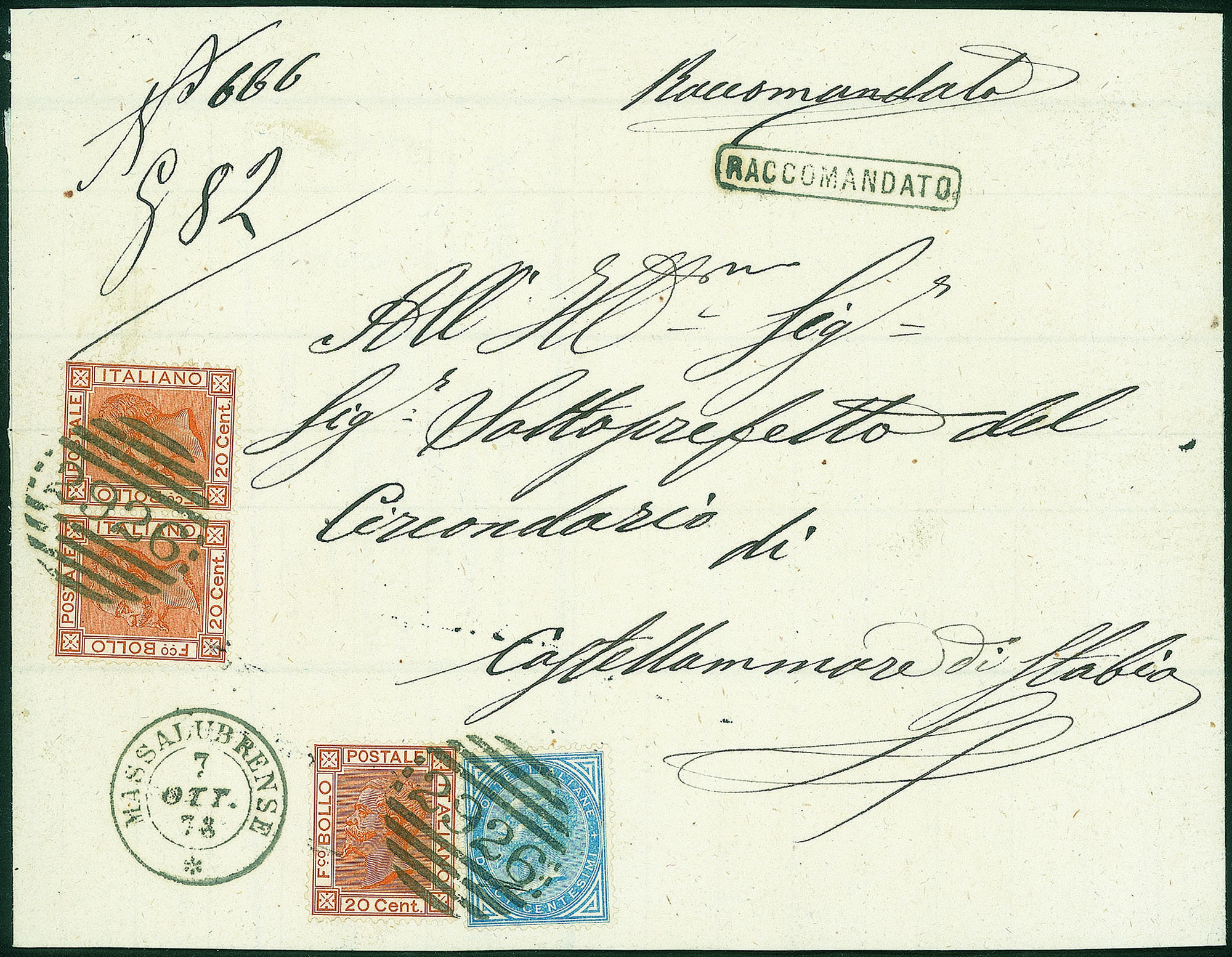 Regno - Vittorio Emanuele II - Raccomandata del 2° portoAffrancata con coppia più singolo del 20 cent (28) + un 10 cent (27) Bigola da Massalubrense a Castellammare di Stabia del 7.10.78