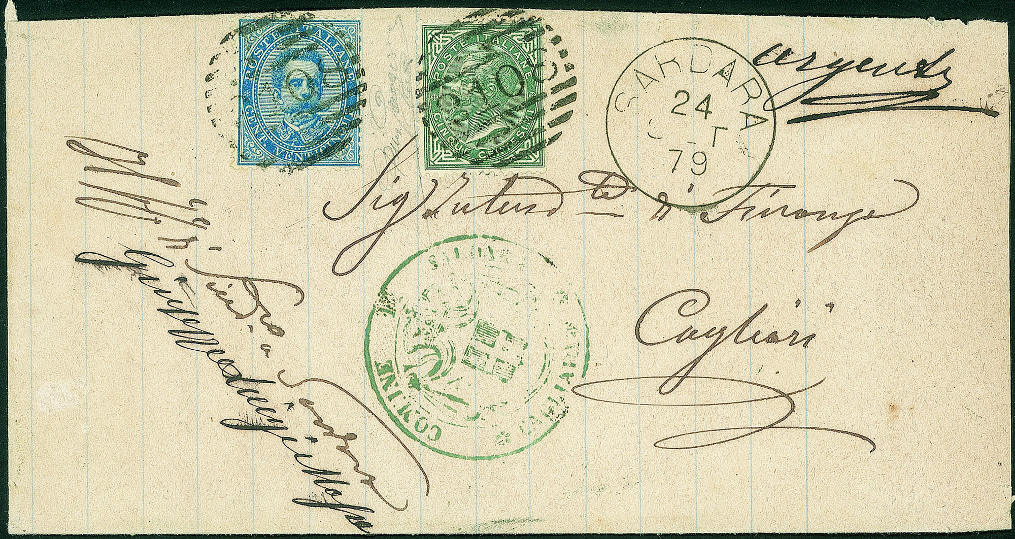 Regno - Umberto I - Uso misto del 5 cent DLR (L16) con il 25 cent Umberto (40)Su involucro di lettera da Sardara a Cagliari del 24.10.79