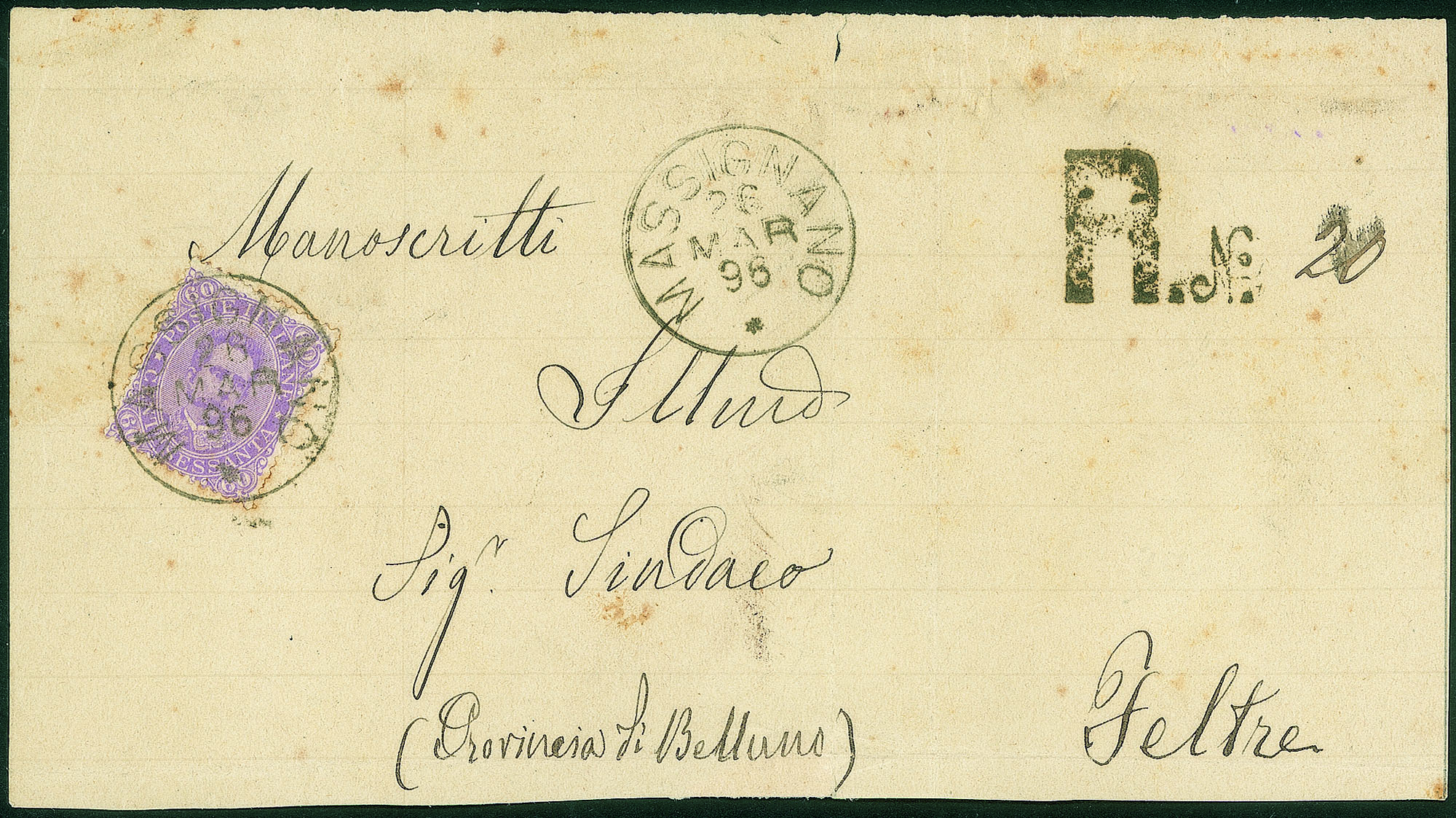Regno - Umberto I - 60 cent violetto (47)Isolato su frontespizio di raccomandata da Massignano a Feltre del 26.3.96 - raro l'uso isolato