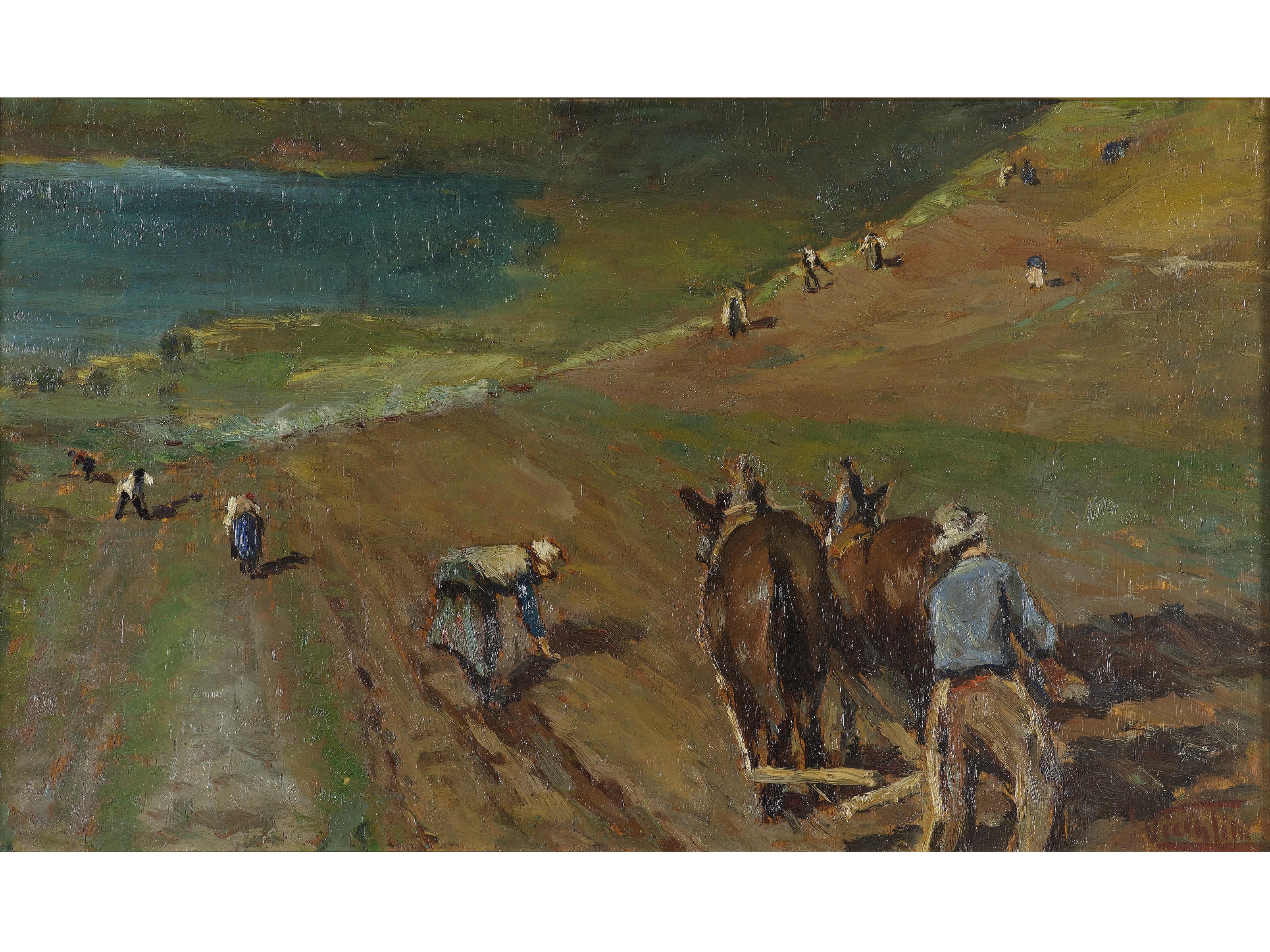 Luigi Vicentini (1901-1970) Paesaggio agricolo con figure e buoi Olio su tavola 30x50 cm