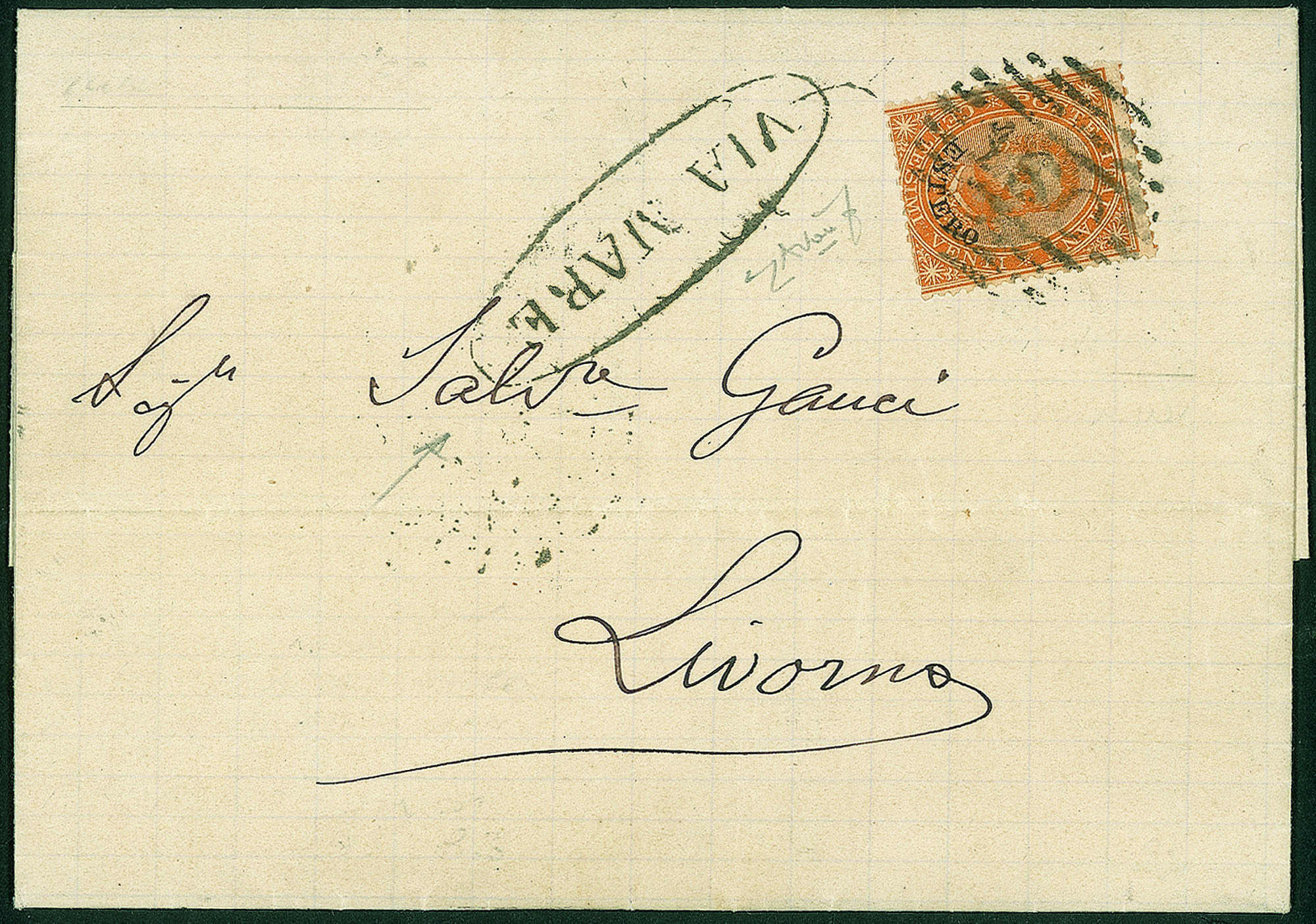 Uffici Postali all'Estero - Levante - Fresca lettera da Tunisi per Livorno affrancata con 20 cent (14)Ben dentellato annullato con numerale a sbarre 160 di Trapani e Via Mare in ovale a lato (P.ti 13) - insieme unico di particolare bellezza - cert. Avanzo