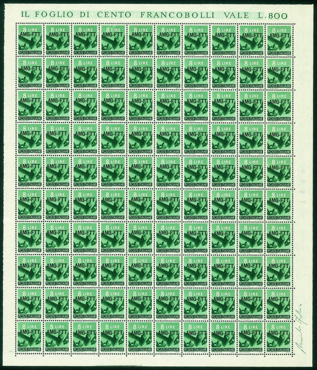 Trieste - Trieste AMG FTT - 1949 - Splendido foglio di 100 esemplari del 8 lire Democratica (61)Gomma integra e bordi completi - raro - cert. oro Fabris