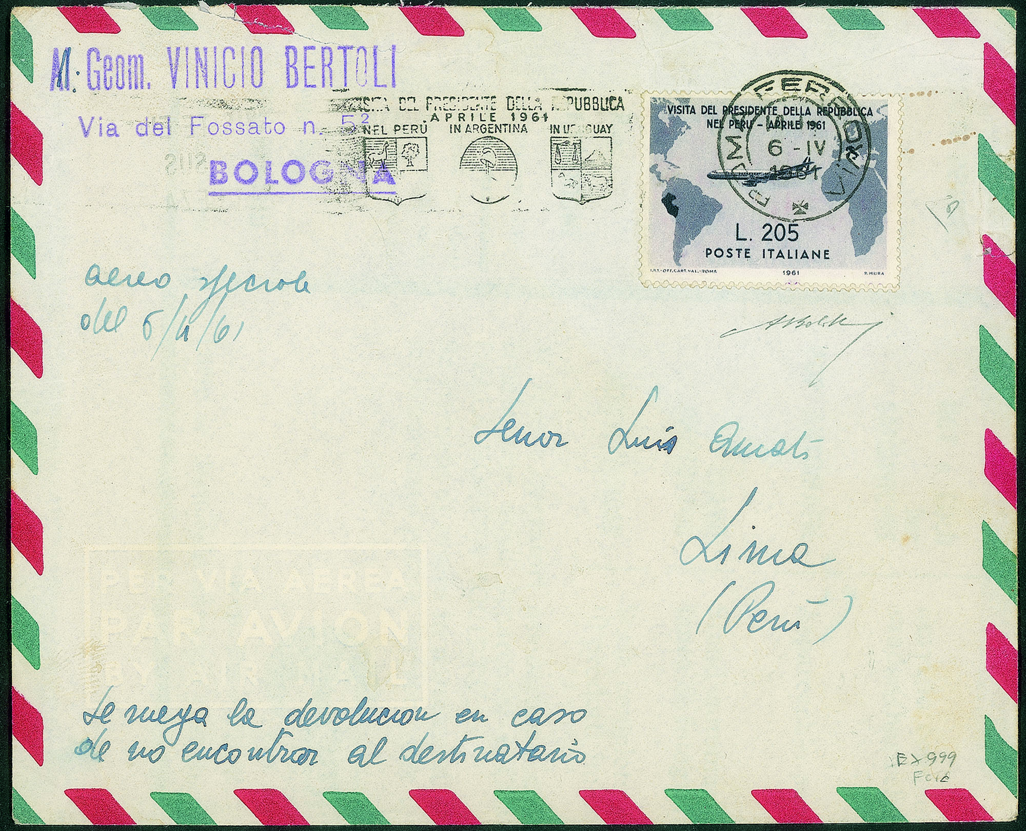 Italia - Repubblica - Aerogramma affrancato con Gronchi Rosa ricoperto dal lilla (920/921)Bollo di arrivo a Lima - Bolaffi + ED