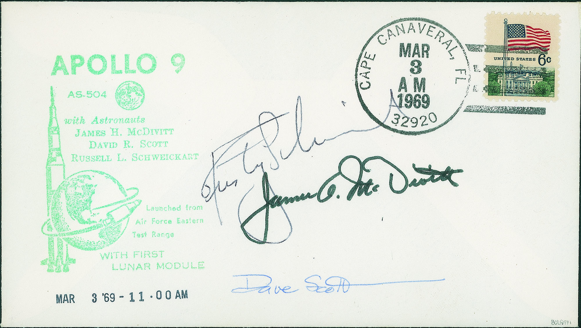 Collezione Spazio - Stati Uniti D'america - Apollo - 1969 - Apollo 9Busta commemorativa della missione con annullo Cape Canaveral Fl. 3.3.69 e firme autografe degli astronauti R. Schweickart J. Divitt e D. Scott - molto bella - Bolaffi