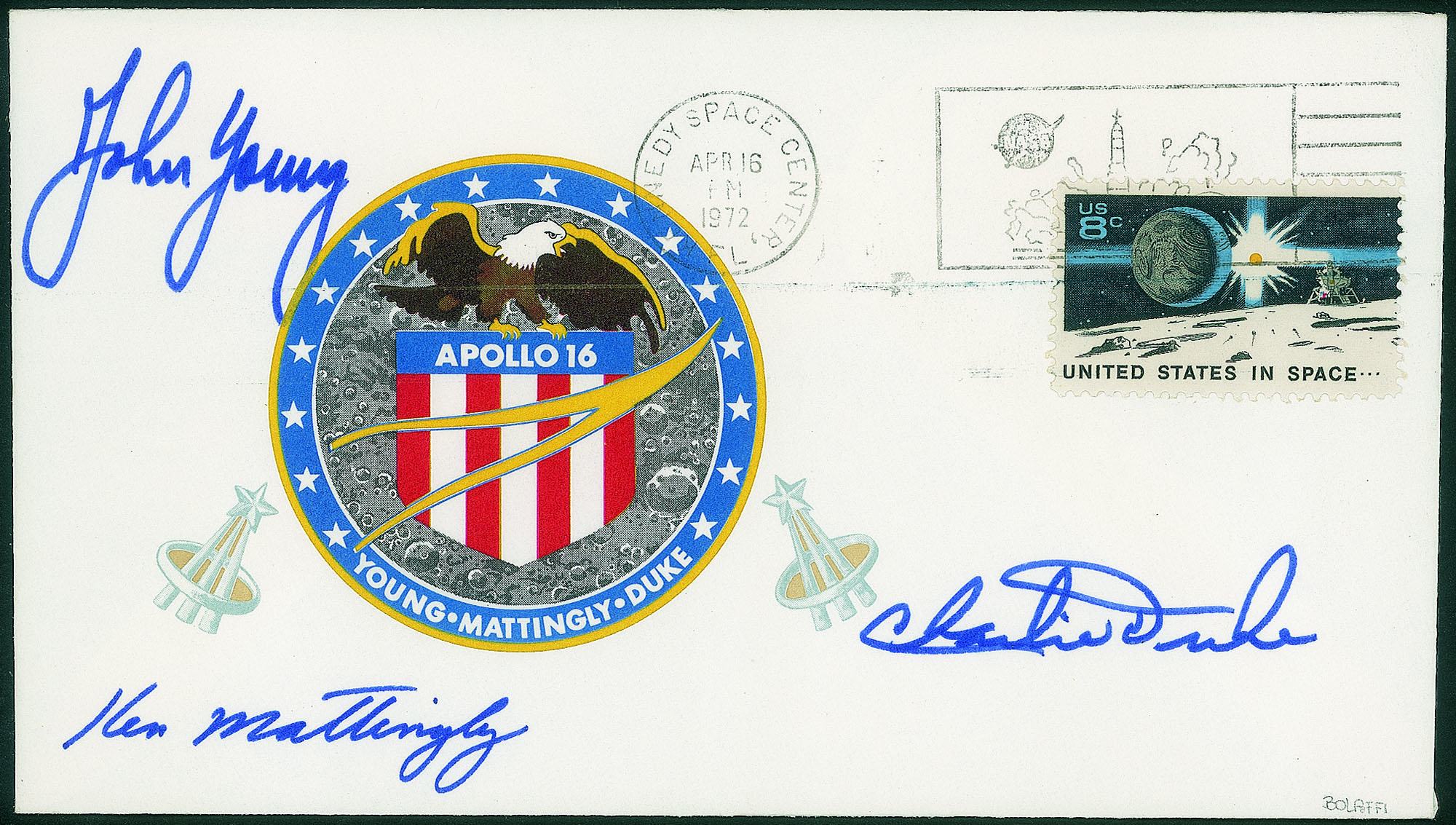 Collezione Spazio - Stati Uniti D'america - Apollo - 1972Insurance cover - busta commemorativa Apollo XVI con firme autografe degli astronauti J. Young K. Mattingly e C. Duke - molto bella - cert. finanziario Bolaffi 100%