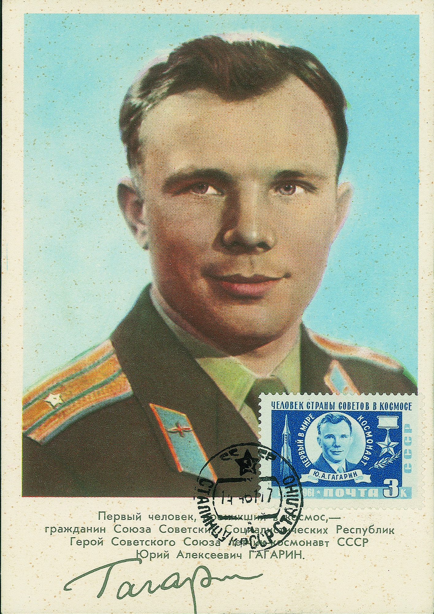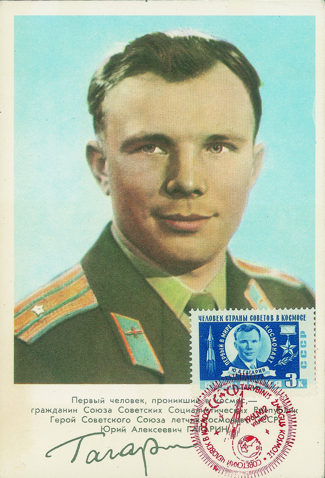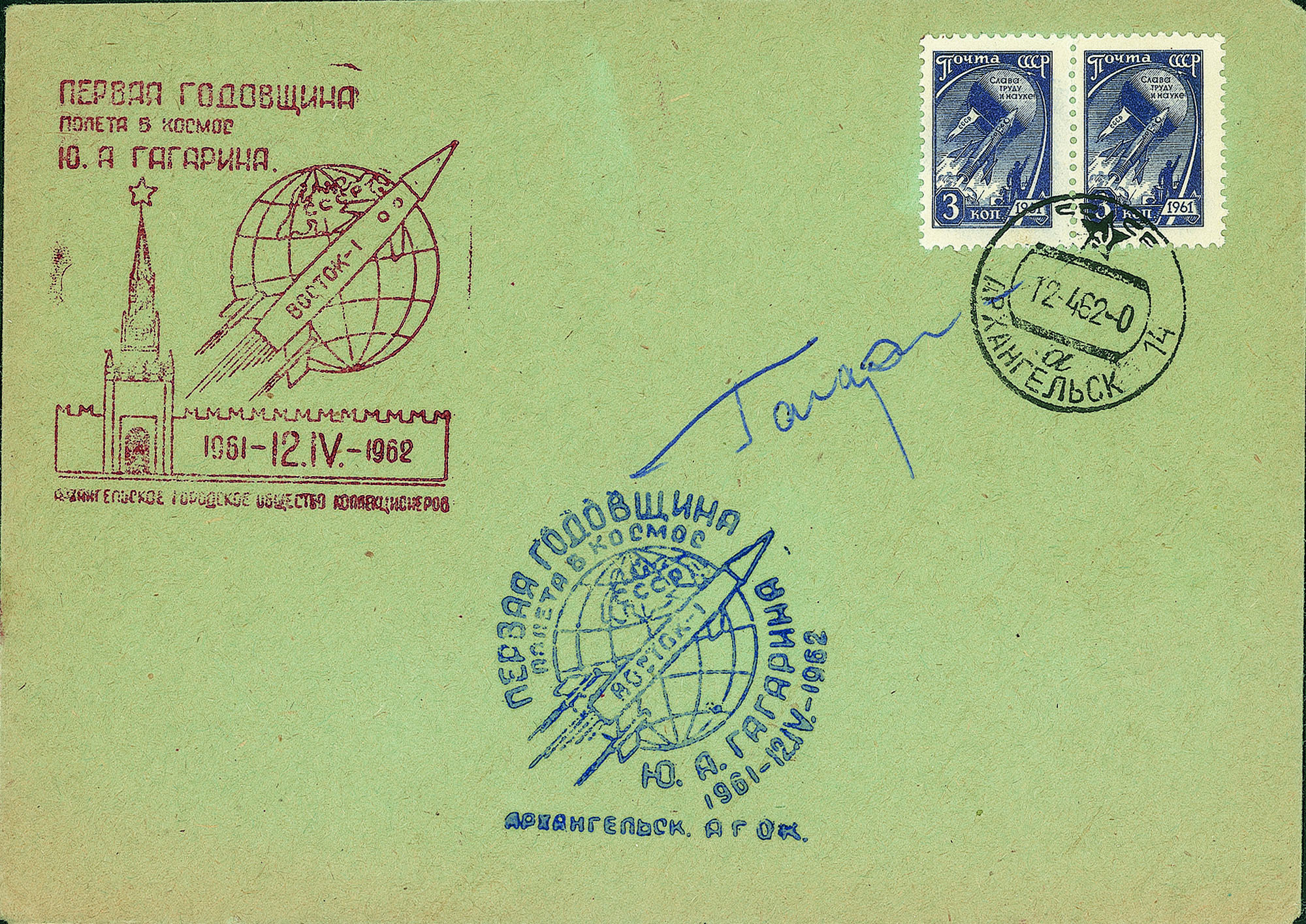 Due cartoline e una busta con la firma autografa del primo uomo nello spazio + una busta del quindicesimo anniversario dello Sputnik 1 - interessante insieme