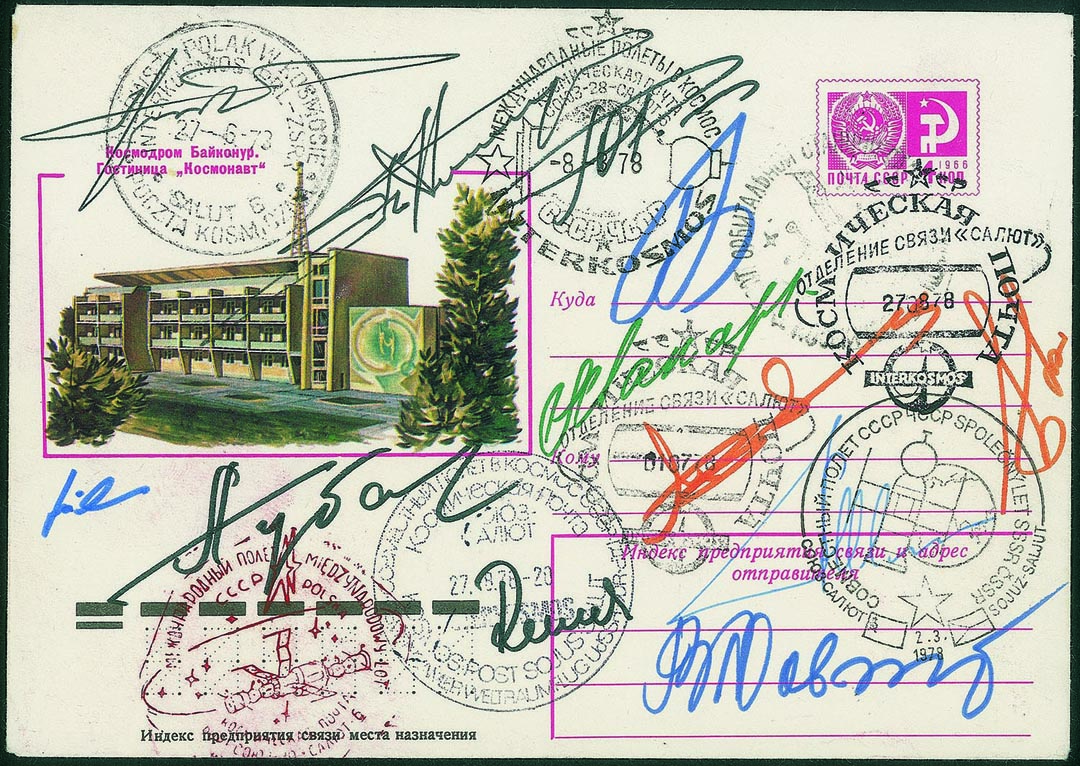 Collezione Spazio - Russia - Soyuz - 1977/1978 - stazione orbitale Salyut-6 - dalla Soyuz 26 alla Soyuz 31Cosmogramma (intero postale) di lunga durata (6 voli spaziali) Ctra cui il primo successo d'aggancio alla Salyut-6 della Soyuz 26 - 8 annulli: sulla tariffa (parziale) commemorativo Salyut-6; 8.8.1978 russo/ceco Interkosmos; 2.3.1978 russo/ceco Interkosmos lancio Soyuz 28; russi/polacchi 1.7.1978, 27.8.1978 aggancio Salyut 31/Salyut-6; polacco 27.6.1978 partenza Soyuz 30 e rosso commemorativo della missione congiunta; 27.8.1978 russo/tedesco Interkosmos, aggancio Soyuz 31 - 12 firme autografe: primo equipaggio della Salyut-6, Soyuz 26, Y.Romanenko, G.Grechko; Soyuz 27, V.Dzhanibekov, O.Makarov; Soyuz 28, A.Gubarev e il primo cosmonauta Interkosmos ceco V.Remek; Soyuz 29, V.Kovalyonok, A.lvanchenkov; Soyuz 30, P.KIimuk e il primo cosmonauta polacco M.Hermaszewski; Soyuz 31, V.Bykovsky e il primo cosmonauta della Repubblica democratica tedesca S.Jàhn - splendido cosmogramma così completo tra annulli e firme autografe