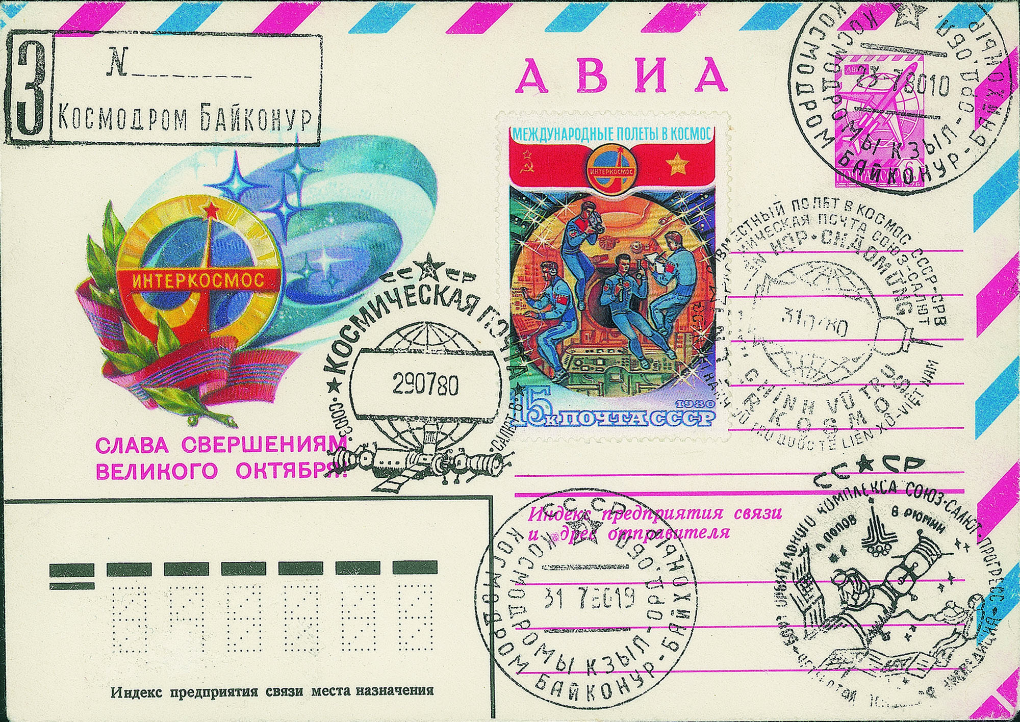 Collezione Spazio - Russia - Soyuz - 1980 - Salyut 6/Soyuz 37Busta postale del lancio URSS/Vietnam partito il 23.7.80 da Bajkonur e qui rientrato il 31.7.80 - cachet Salyut 29.7.80 + cachet Giochi Olimpici - ottima qualità