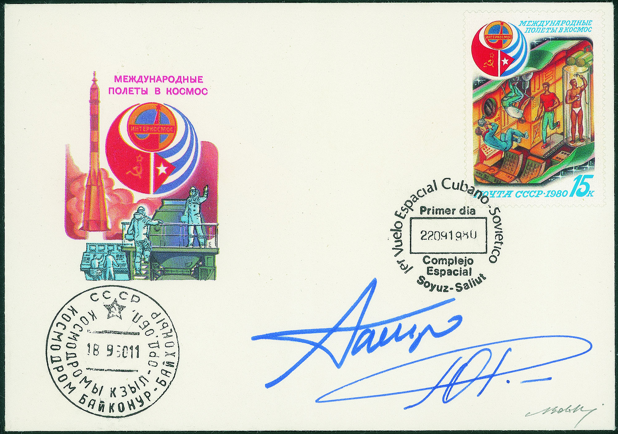 Collezione Spazio - Russia - Soyuz - 1980 - stazione orbitale Salyut-6 - Soyuz 38Cosmogramma del volo Intercosmos sovietico-cubano Soyuz 38 (18.9.-26.9.1980) - annullo 'Cosmodromo Baikonur 18.9.80', lancio, e annullo 'primo volo cubano-sovietico 22.09.1980 complesso spaziale Soyuz-Salyut' apposto a bordo - firme autografe dei cosmonauti: Y.Romanenko e A.Mendez (primo cosmonauta da Cuba) - ottima qualità - Bolaffi + cert. Kniga + cert. Interkosmos