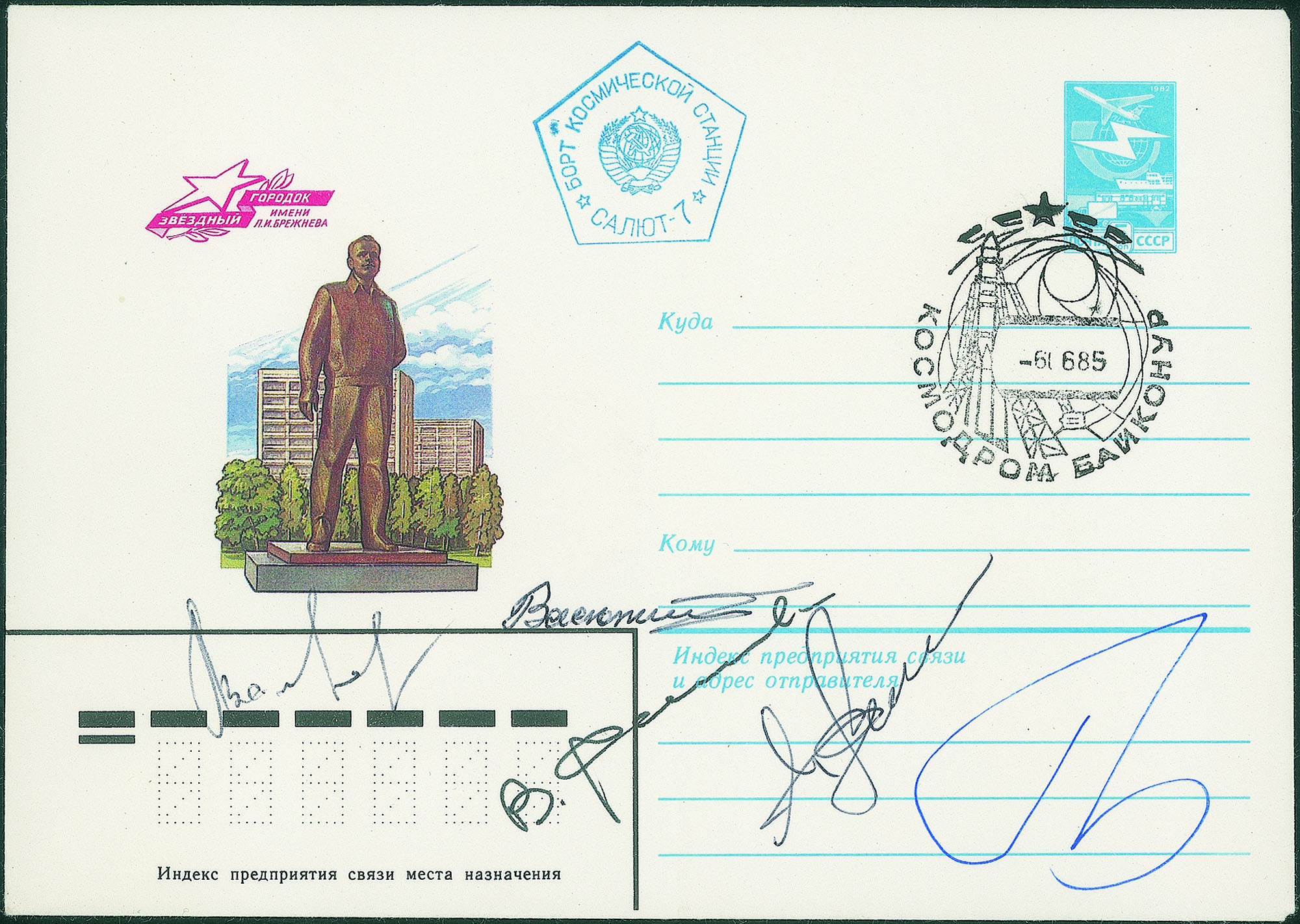 Collezione Spazio - Russia - Soyuz - 1985 - stazione orbitale Salyut-7 - Soyuz T-13Cosmogramma del volo Soyuz T-13 partito il 6.6.1985 e ritornato con la stessa navicella ma con diverso equipaggio il 25.9.1985 - annullo 'Cosmodromo Baikonur 6.6.85', lancio, e bollo pentagonale di bordo Salyut-7 - firme autografe dell'equipaggio T-13, V.Dzhanibekov e V.Savinykh e di 3 cosmonauti, membri dell'equipaggio della Soyuz T-14, aggancio/Salyut-7 18.9.1985, V.Vasyutin, G.Grechko e A.VoIkov - ottima qualità e busta non comune - Bolaffi + cert. Kniga