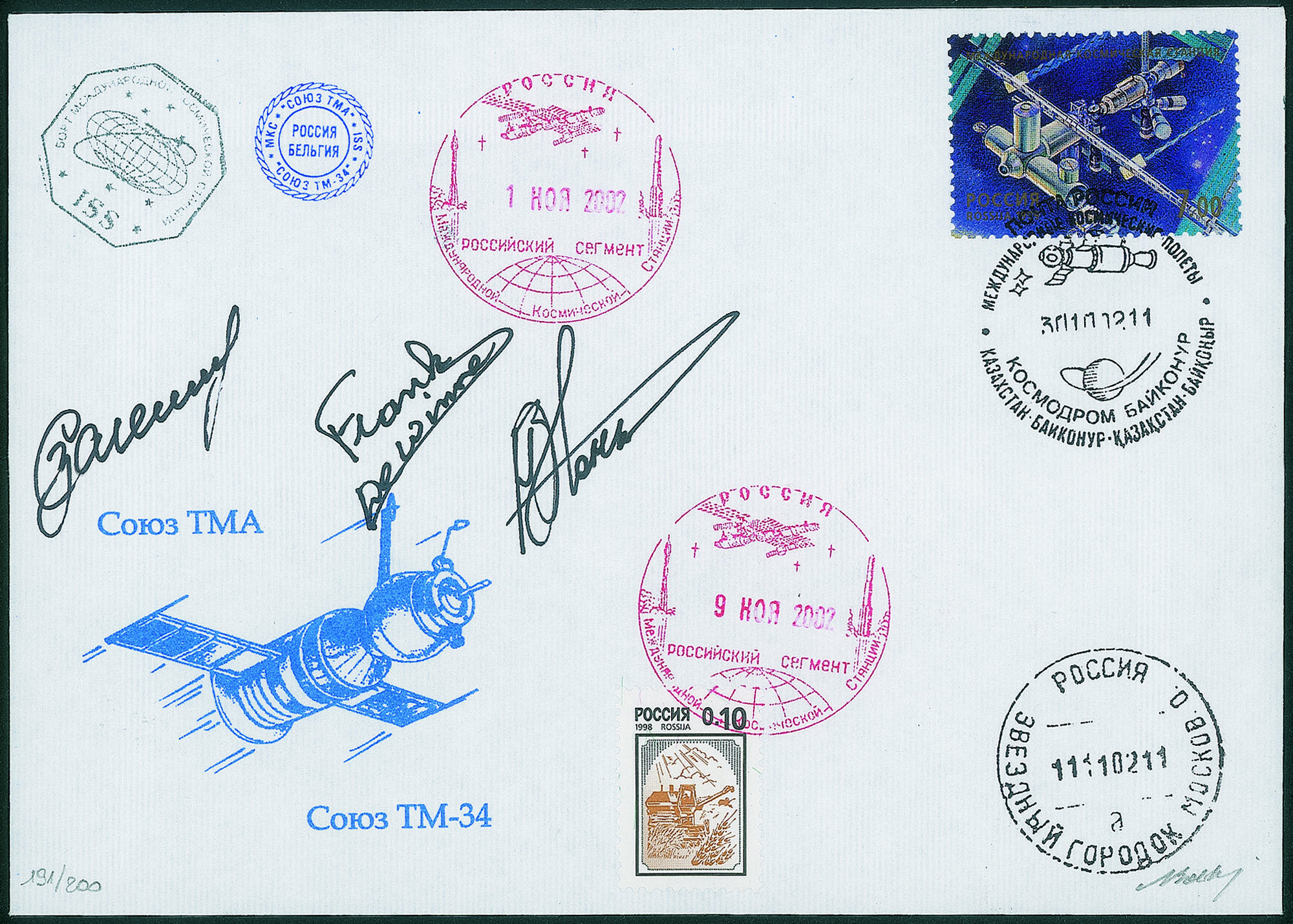 Collezione Spazio - Stazione Spaziale Internazionale - Missioni congiunte - 2002 - Soyuz TMA-1Cosmogramma 'Zaletin' n.191 di 200 trasportato dal volo russo-belga Soyuz TMA-1 sulla Stazione Spaziale Internazionale - annullo di partenza dal Cosmodromo di Baikonur del 30.10.2002, timbro a doppio cerchio azzurro dell'equipaggio Soyuz TMA-1 e Soyuz TM-34, due annulli rosso 'Russian Segment of International Space Station', timbro ottagonale di bordo 'ISS', annullo circolare della 'Città delle Stelle' - al verso foglietto con citazione del pioniere russo Tsiolkovsky + timbro a doppio cerchio azzurro Soyuz TMA-l/TM-34 e timbro ovale azzurro 'Odissea' - firme autografe dell'equipaggio S.Zaletin, Y.Lonchakov e il belga F.De Winne - ottima qualità - Bolaffi + cert. di autenticità del Comandante V. Zaletin